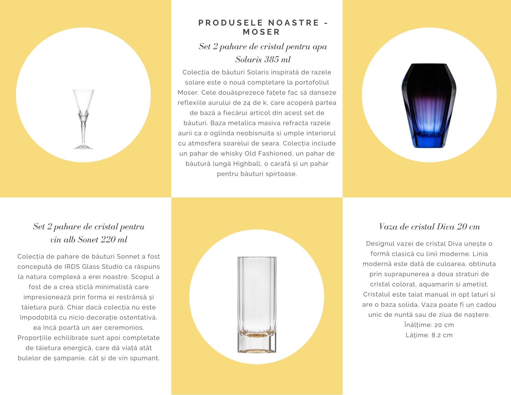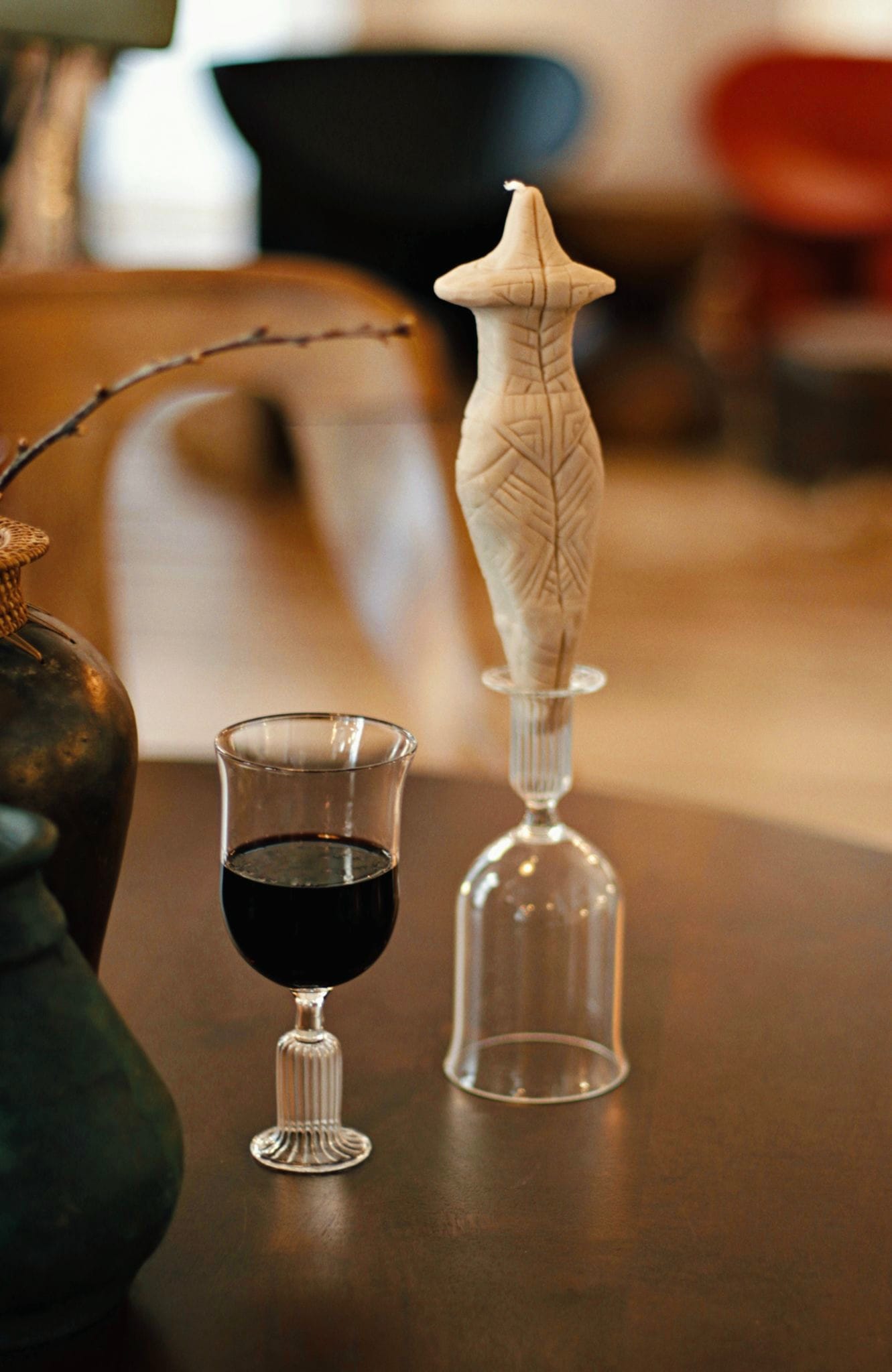 O colecție limitată de pahare sustenabile ce spun o poveste. Spun povestea vinului, a prieteniei cu mediul și a tehnicii suflatului sticlei. Spun povestea Paharului care a mai fost odată pahar sau vază sau decantor, dar s-a spart. Visat și desenat de Ioana Voloacă, Creative Director & Founder ESHTE, adus la viață de către Laura Chiriac, în corpul paharului de vin “with a twist”: întors cu gura în jos, paharul devine sfeșnic. Setul conține două pahare de vin lucrate manual, din sticlă reciclată.