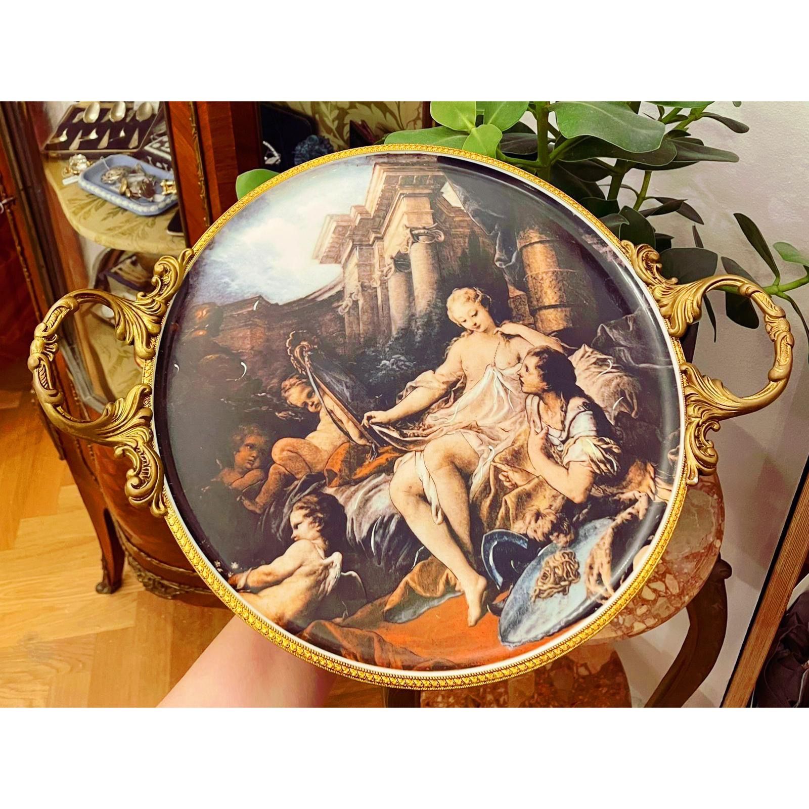 - Platou. Această piesă superbă este un platou semnat Limoges, pictat manual, cu detalii din bronz doree. Pictura din interiorul său este o replică a unei lucrări celebre a celui mai prolific pictor francez al secolului 18.