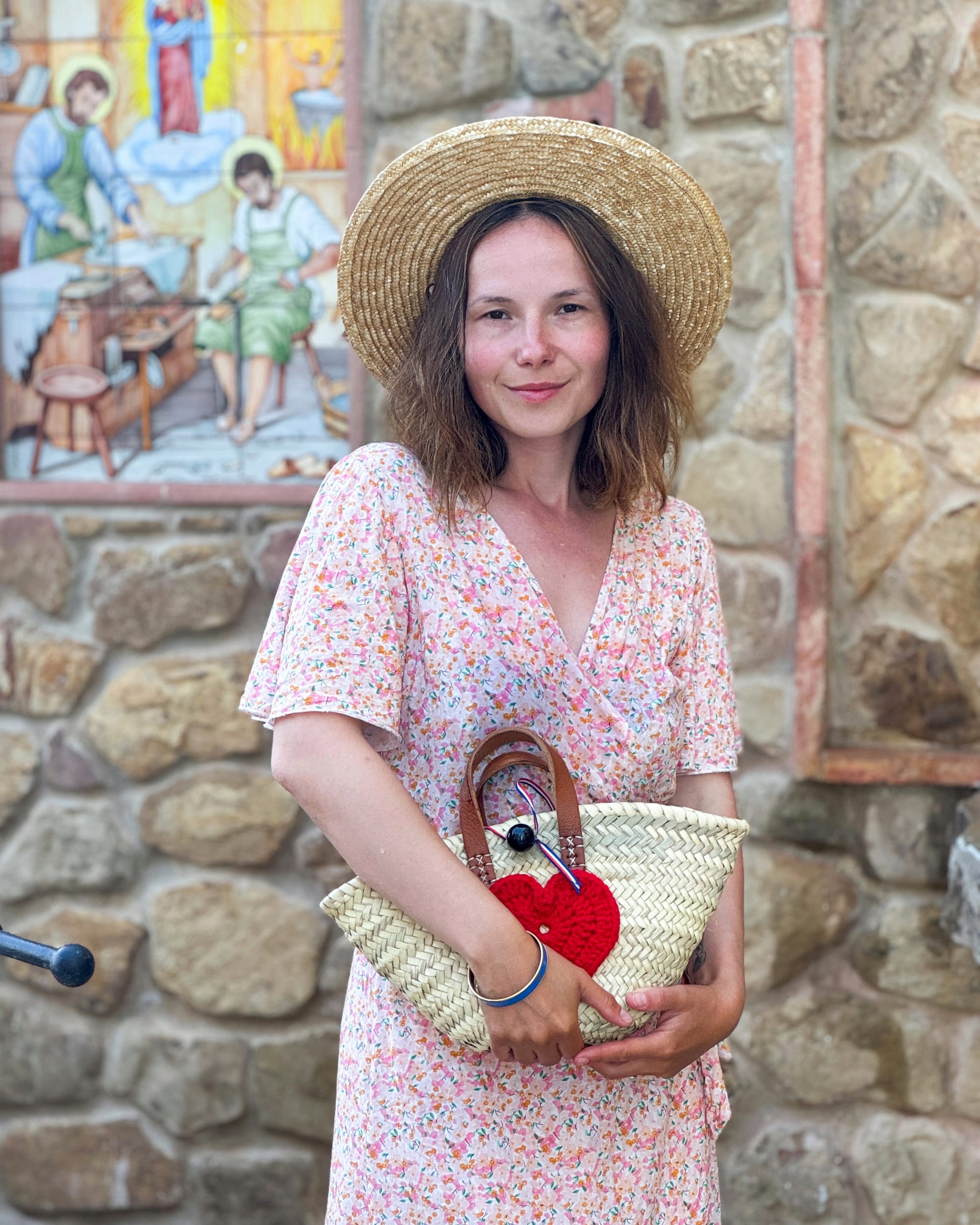 I put on a wrap flower dress, a wicked basket, and a made-to-measure hat to complete my ideal outfit, which is embellished with the Monochrome bracelet in blue pastel. I could walk for hours and only stop to take photos because all of the white villages in this area are very Instagrammable.