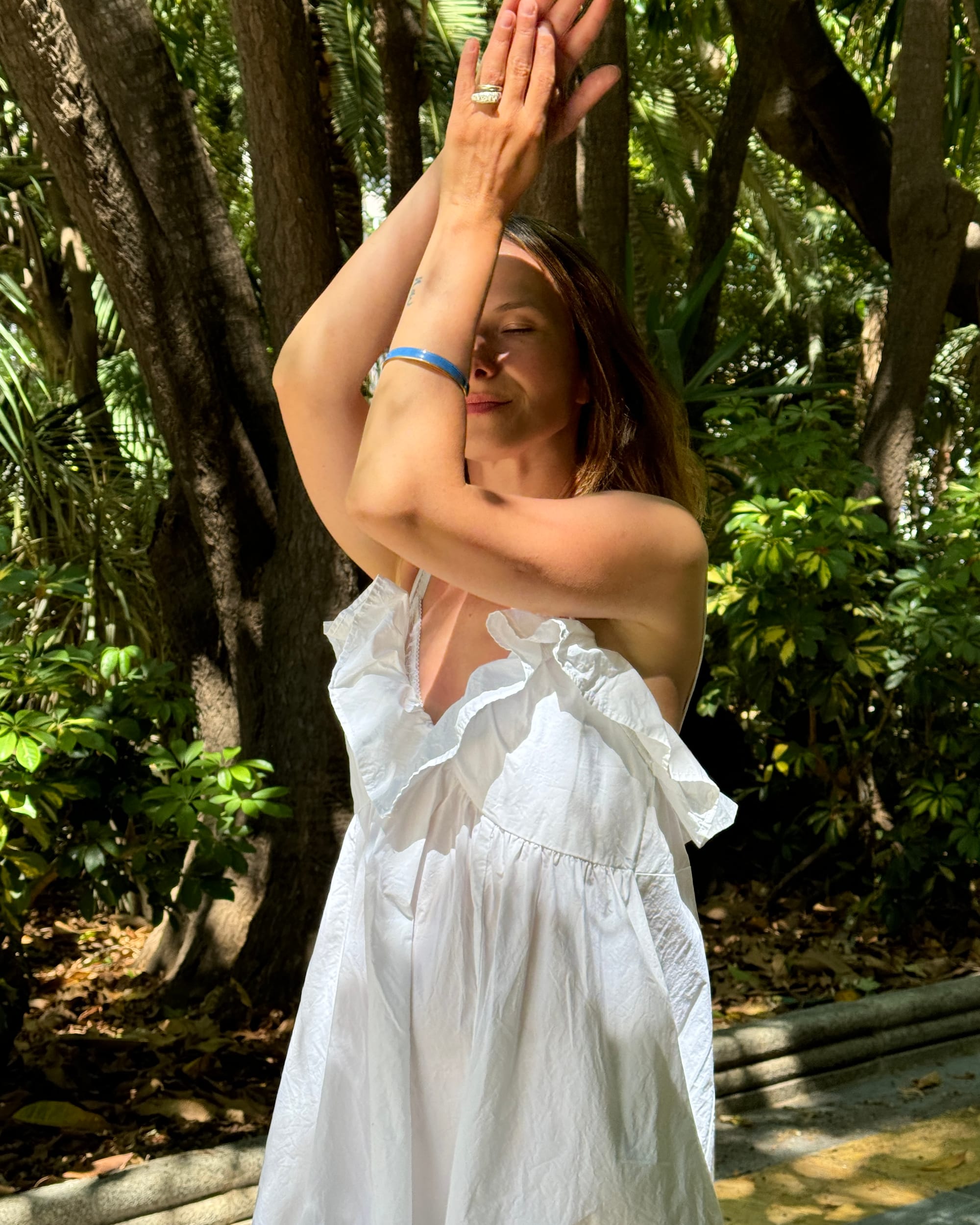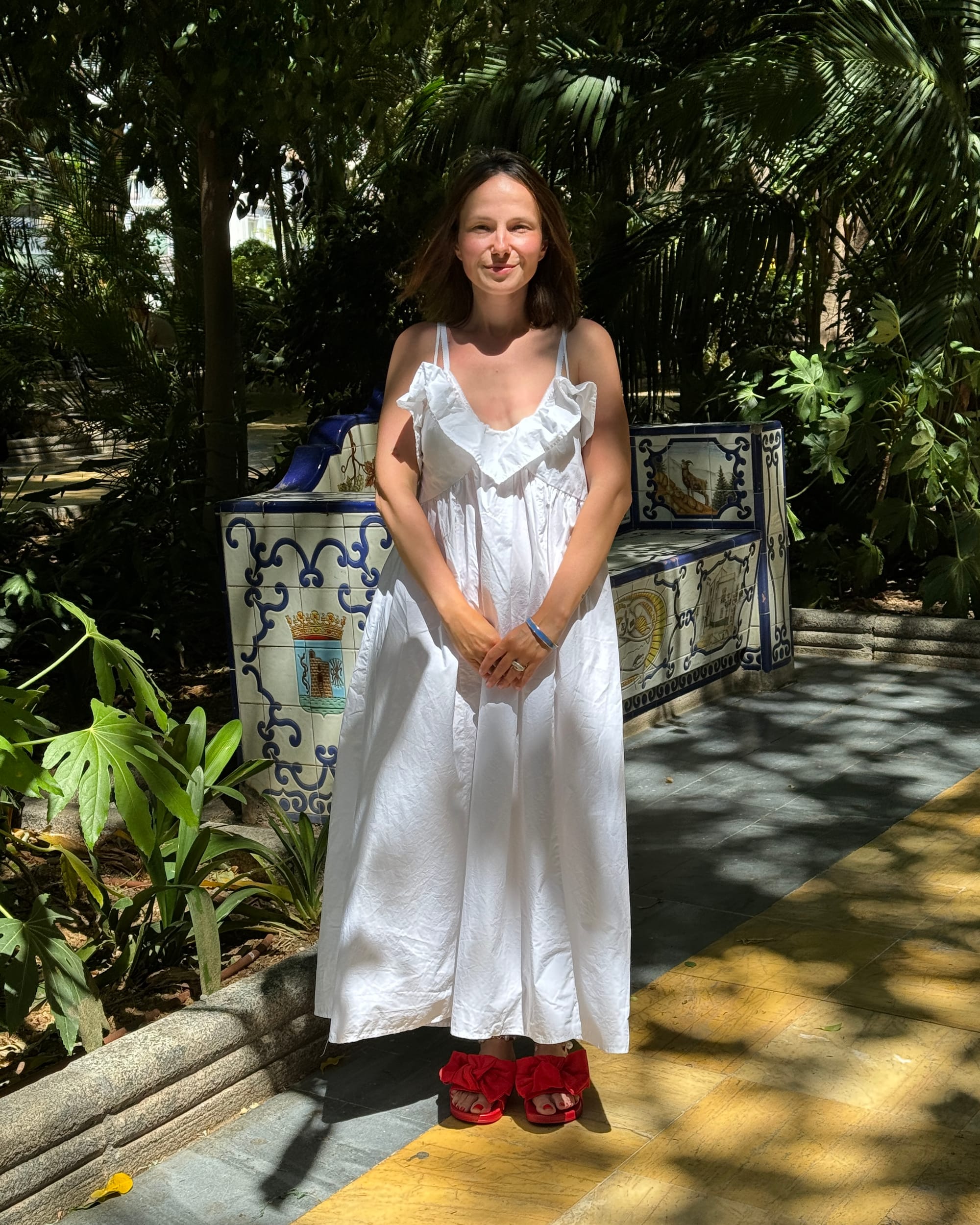 Whenever I need to go to Estepona, San Pedro, or Marbella for various errands, I prefer to wear something light and comfortable. As summer approaches, temperatures on the Costa del Sol rise. So a white dress seems like the ideal choice. I paired this simple outfit with a pair of red flats and FREYWILLE's Monochrome Bangle in pastel blue. And, as you can see from the photos below, I felt very feminine and confident in my own skin.