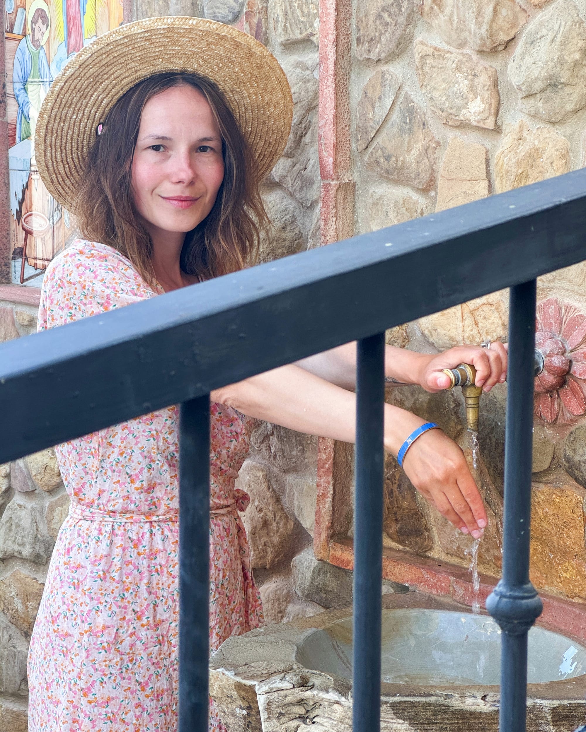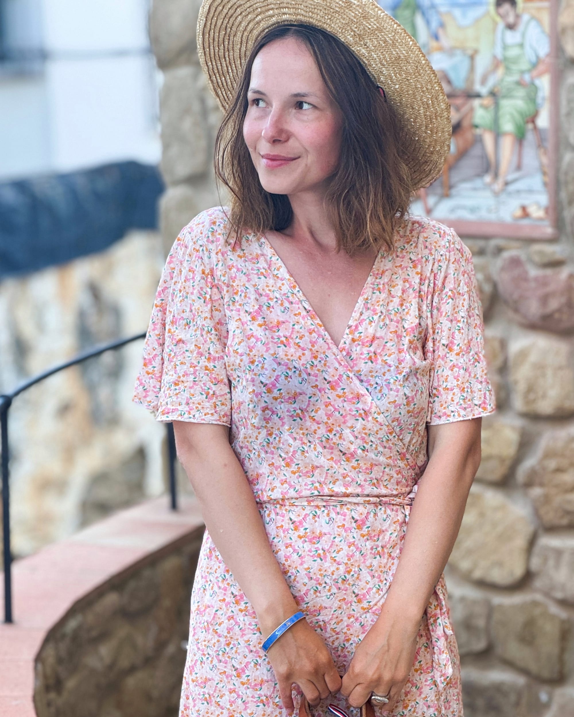 I put on a wrap flower dress, a wicked basket, and a made-to-measure hat to complete my ideal outfit, which is embellished with the Monochrome bracelet in blue pastel. I could walk for hours and only stop to take photos because all of the white villages in this area are very Instagrammable.