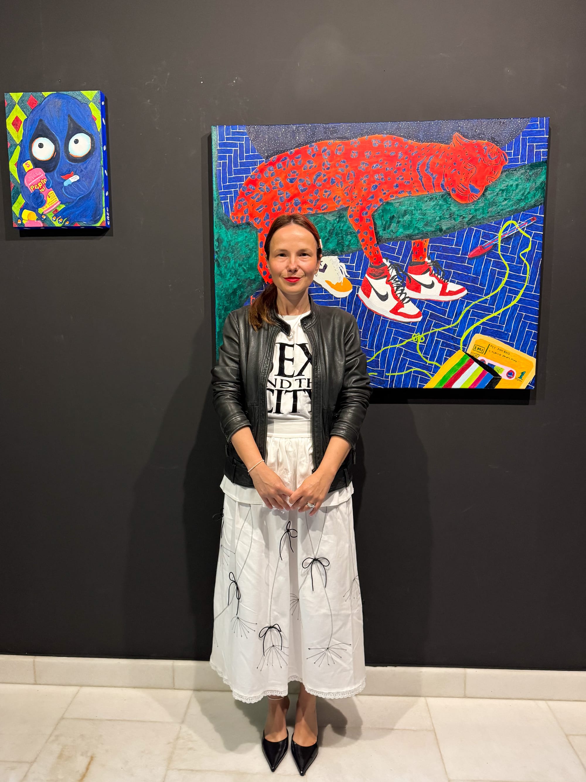 It’s very difficult for me to choose one piece among the seven in the exhibition because every painting I create is based on my life experience; they are self-referential. This means that in each painting, there are certain elements I rescue from my past and apply, transforming them into objects, animals, or backgrounds. I would choose the painting of the bear; I really enjoyed painting that one.
