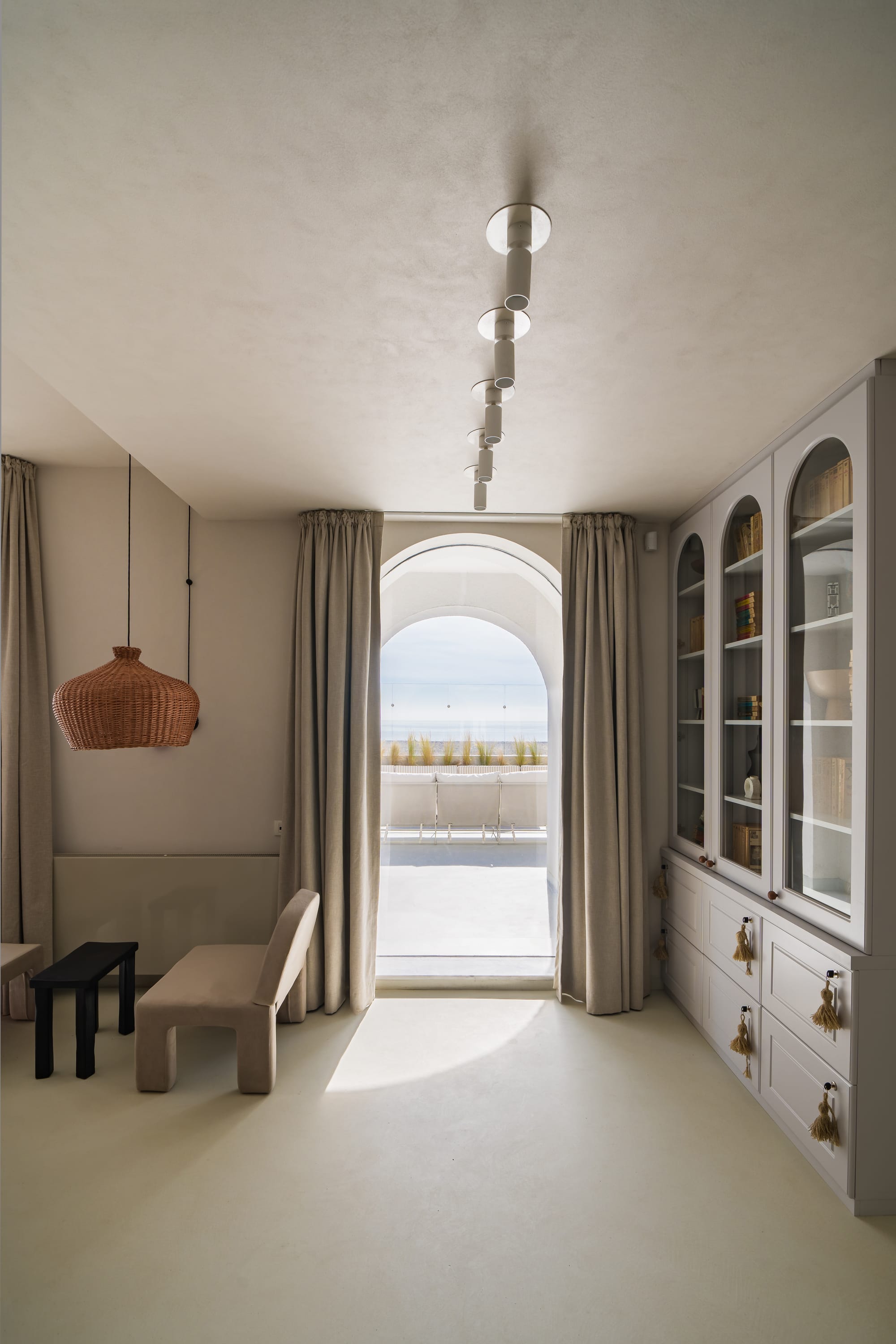 The Annterior Studio team has reinterpreted the wabi-sabi philosophy in a contemporary context, creating a space that emphasizes the beauty of simplicity and authenticity. The design features an exquisite blend of organic forms in monochrome shades, natural materials, and vintage objects, enhanced with various art forms, from Romanian sea-inspired paintings to Techirghiol stone sculptures signed by local artist George Culea.