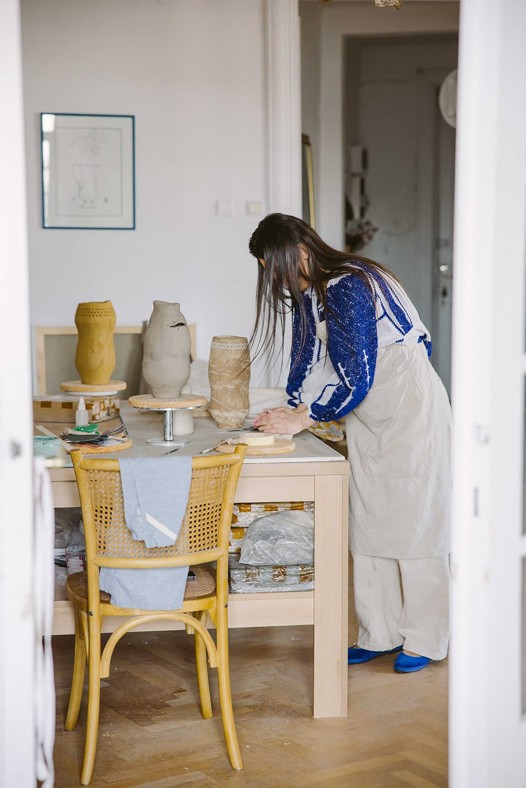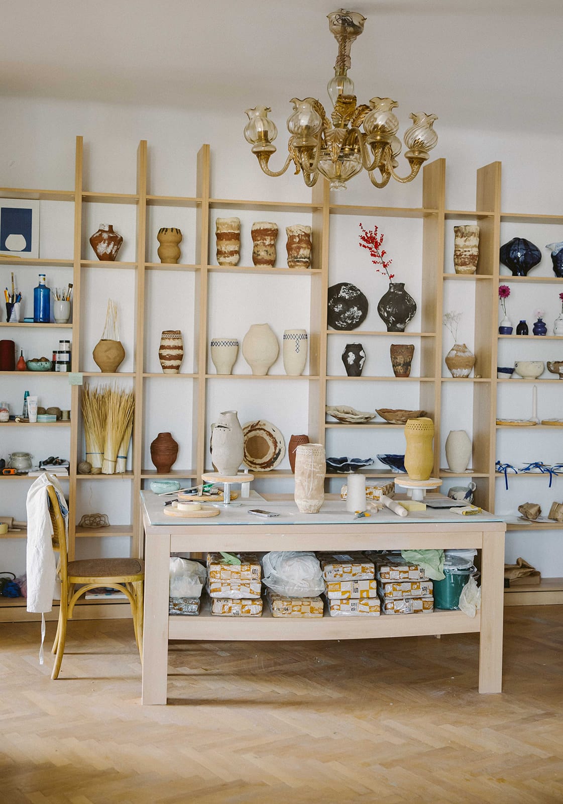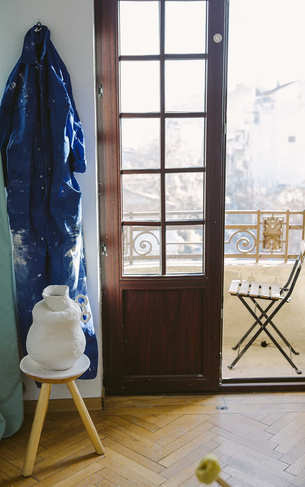 My studio is based in central Bucharest in a 1930s building. It has character, featuring original elements like patinated wooden floors, wide windows, and charming architectural details. It became a co-creator in my process; that's why I have decided to organise an offline event here, called Open Doors Studio, 3–4 times per year. A different meet-and-shop vibe.