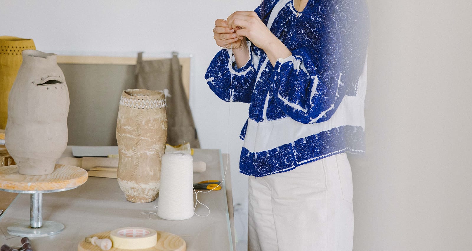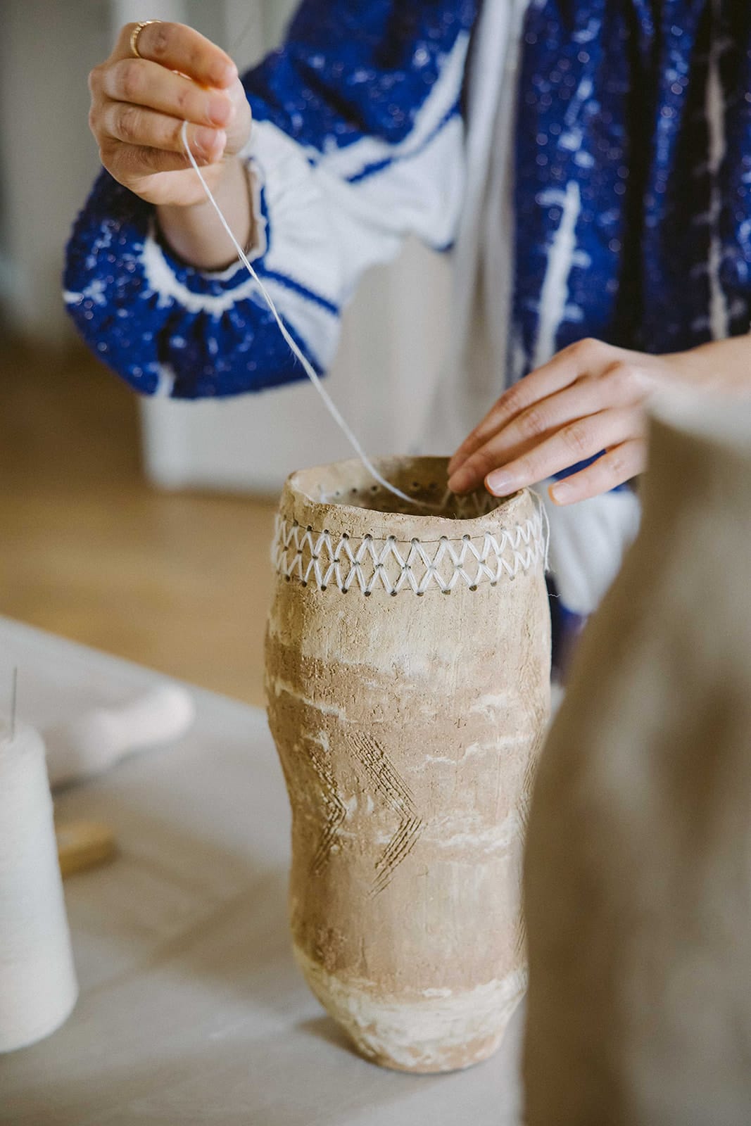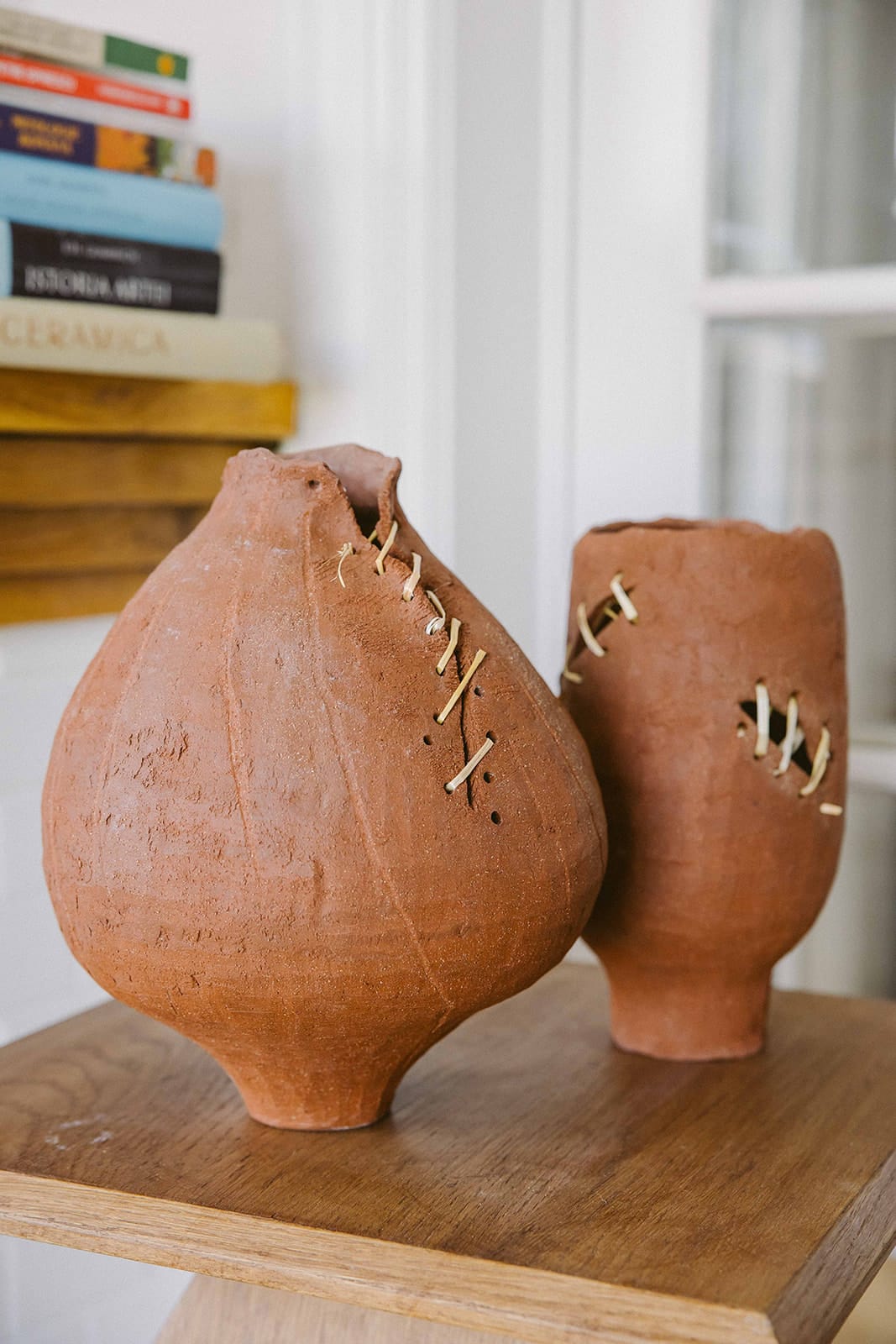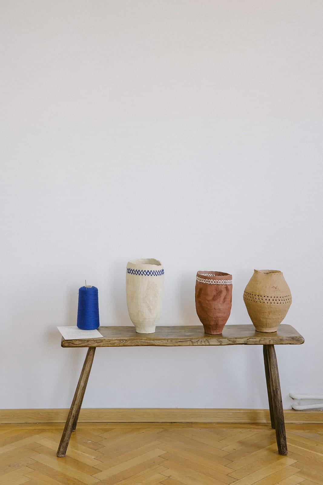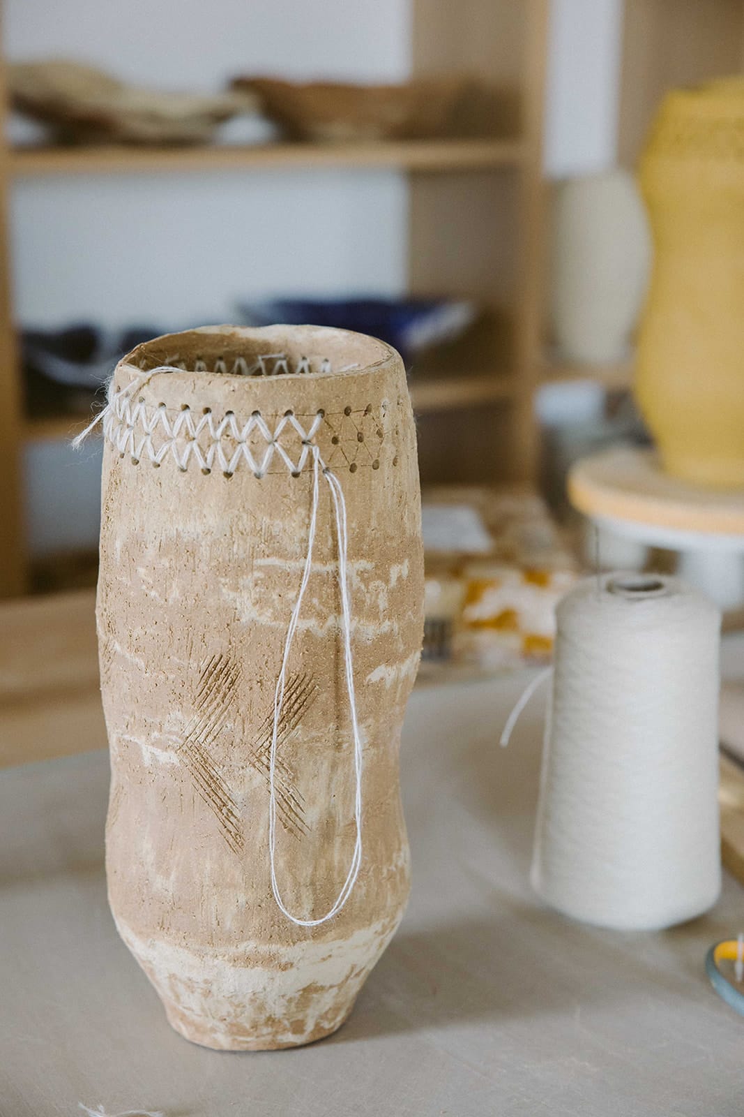 I try to create intimate dialogues between clay and traditional materials, such as wool or straw.