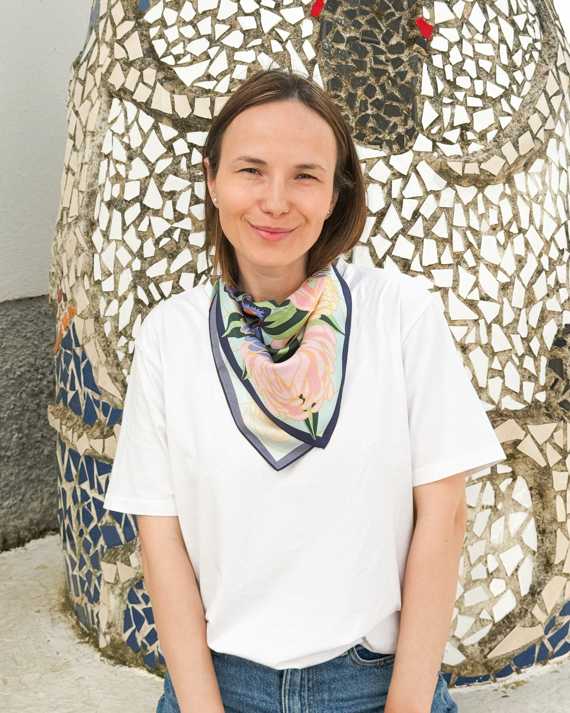 So it’s basically mixing impeccable aesthetics with practicality. I own 2 FREY WILLE silk scarves, which I wear in so many different ways: tied loosely around my neck, draped over my shoulders, tied on my head, or even knotted onto my handbag.