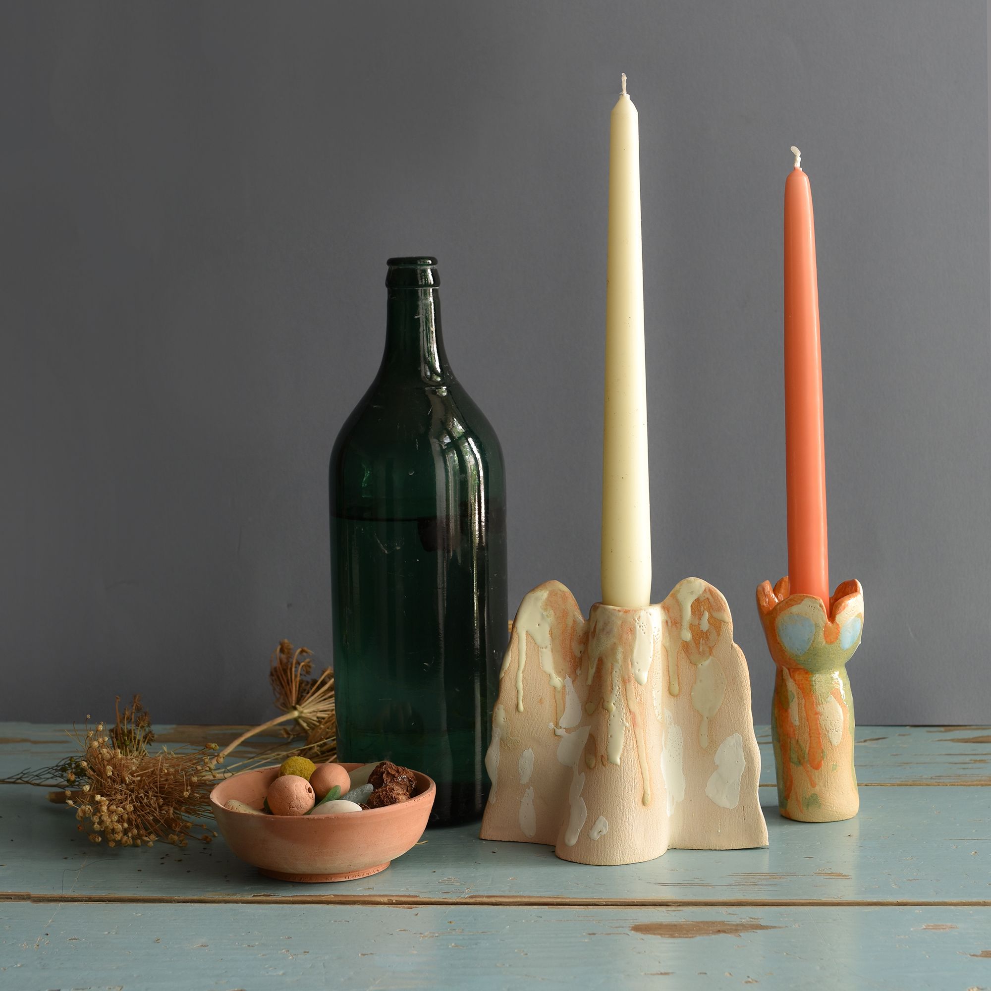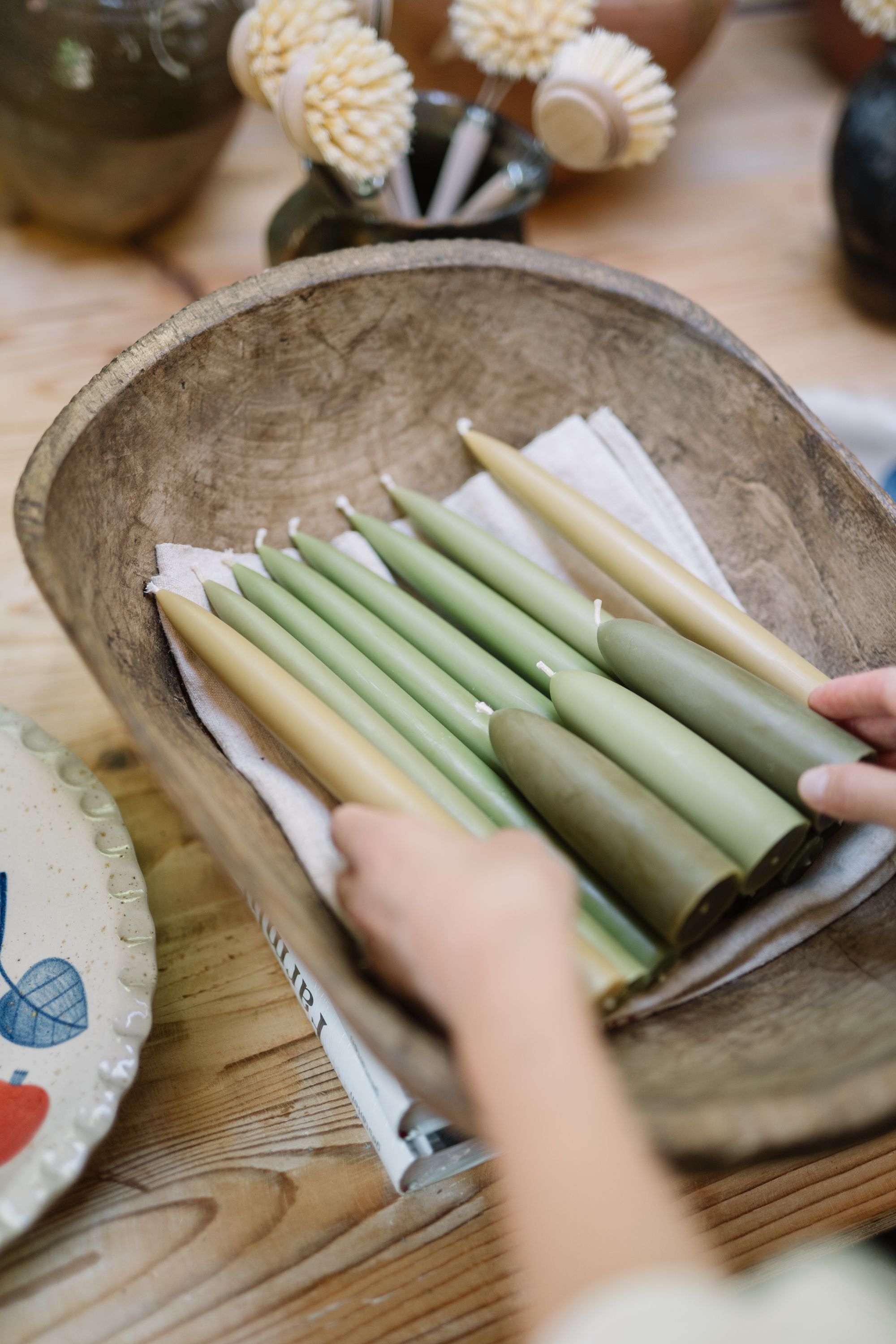 Lumânări rulate manual, din ceară naturală de albine sau lumânări parfumate din ceară de soia turnate în porțelan de colecție și sfeșnice recondiționate, în ton cu frumusețea și delicatețea celorlalte produse.