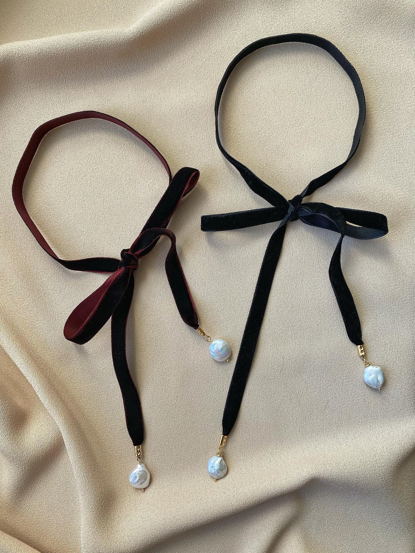 Pentru perioada festivă din acest an, am ales să confer bijuteriilor o notă romantică, fundițele fiind în centrul atenției. Am optat pentru catifea neagră, burgundy și perle baroque împodobite cu sârmuliță placată cu aur.