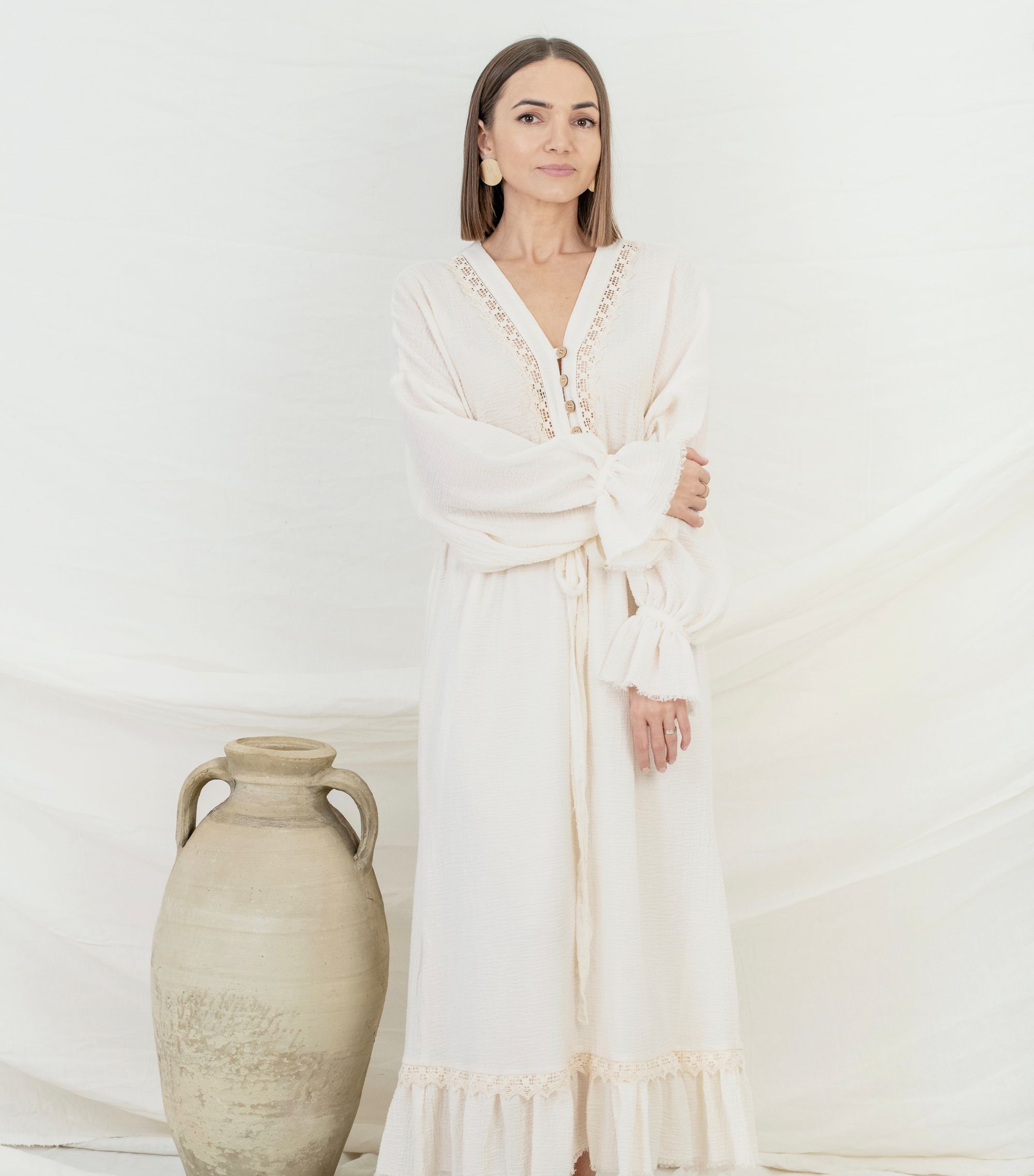 Am ales să lucrăm cu țesături naturale precum cânepa, bumbacul organic, pânza topită, muselina și inul cu gândul la întoarcerea spre autentic, grija față de natură și ceea ce purtăm.
