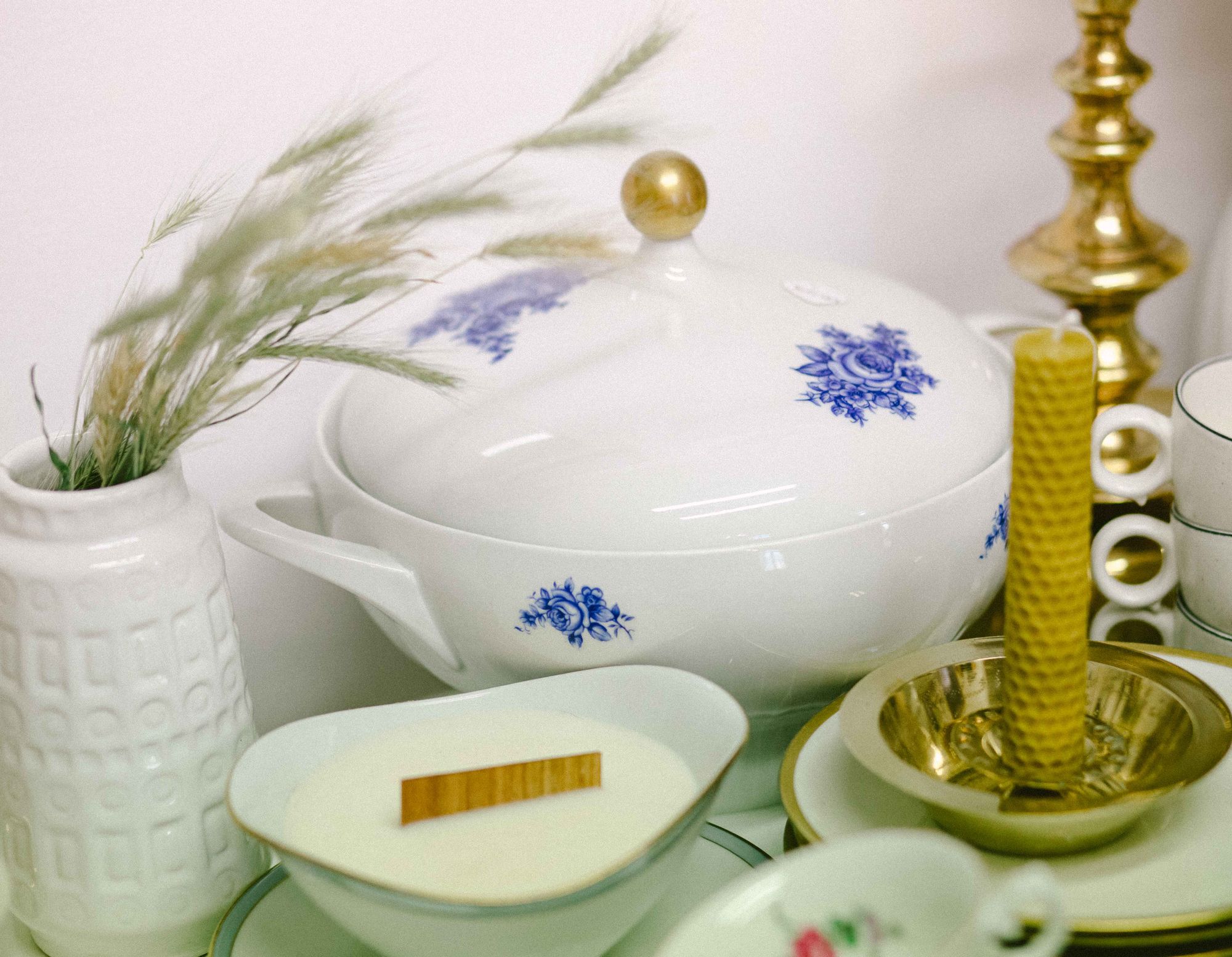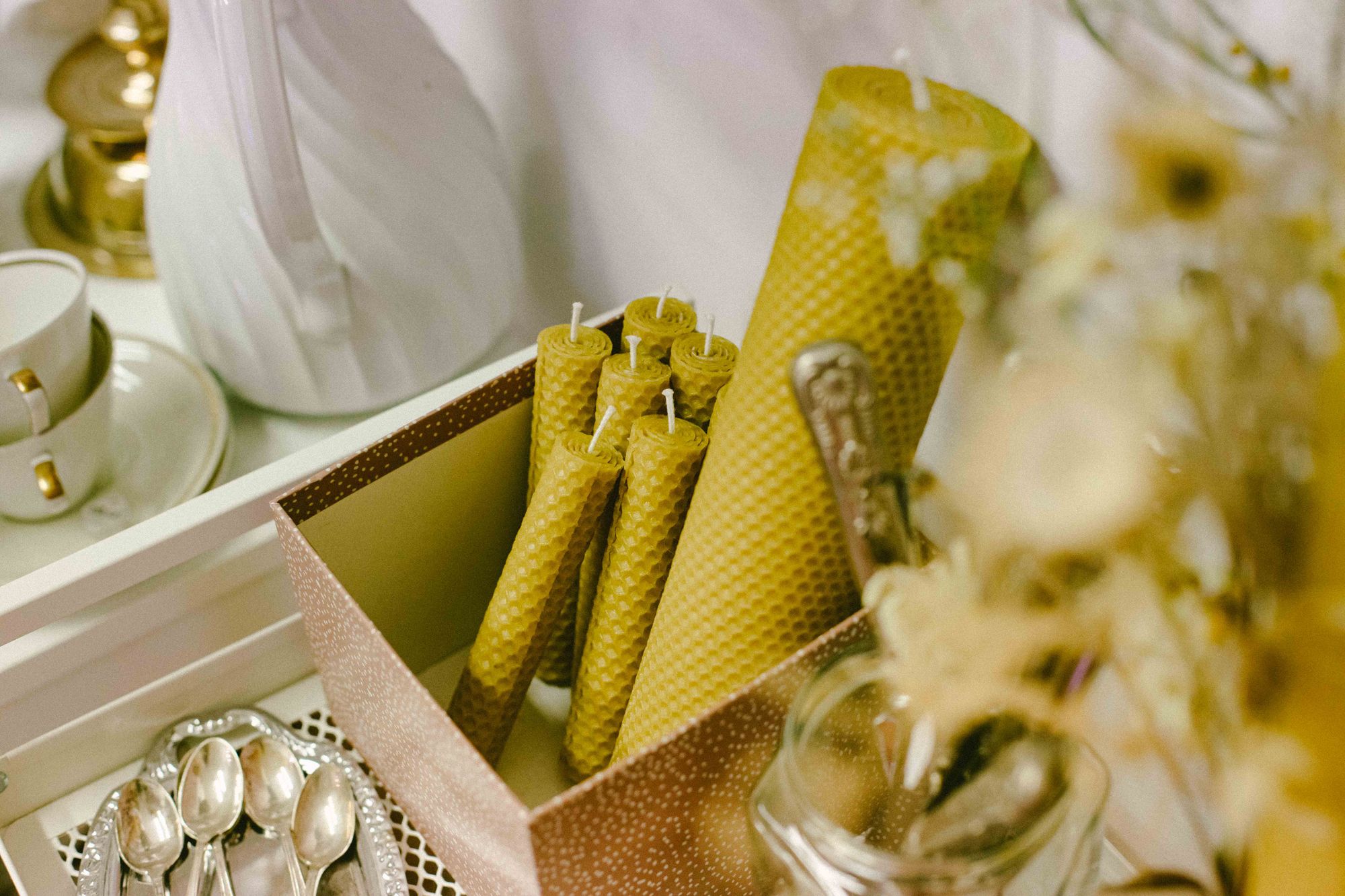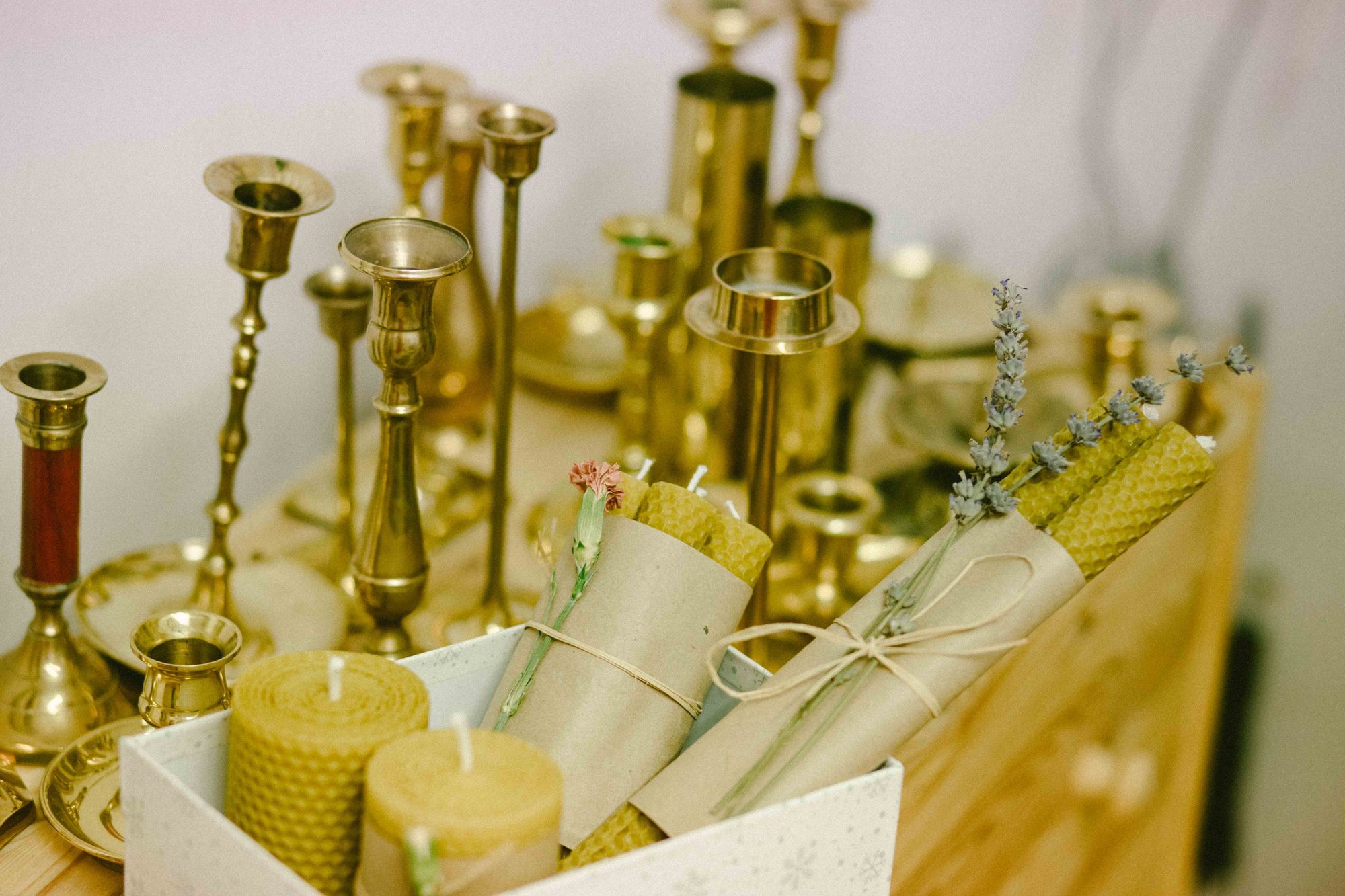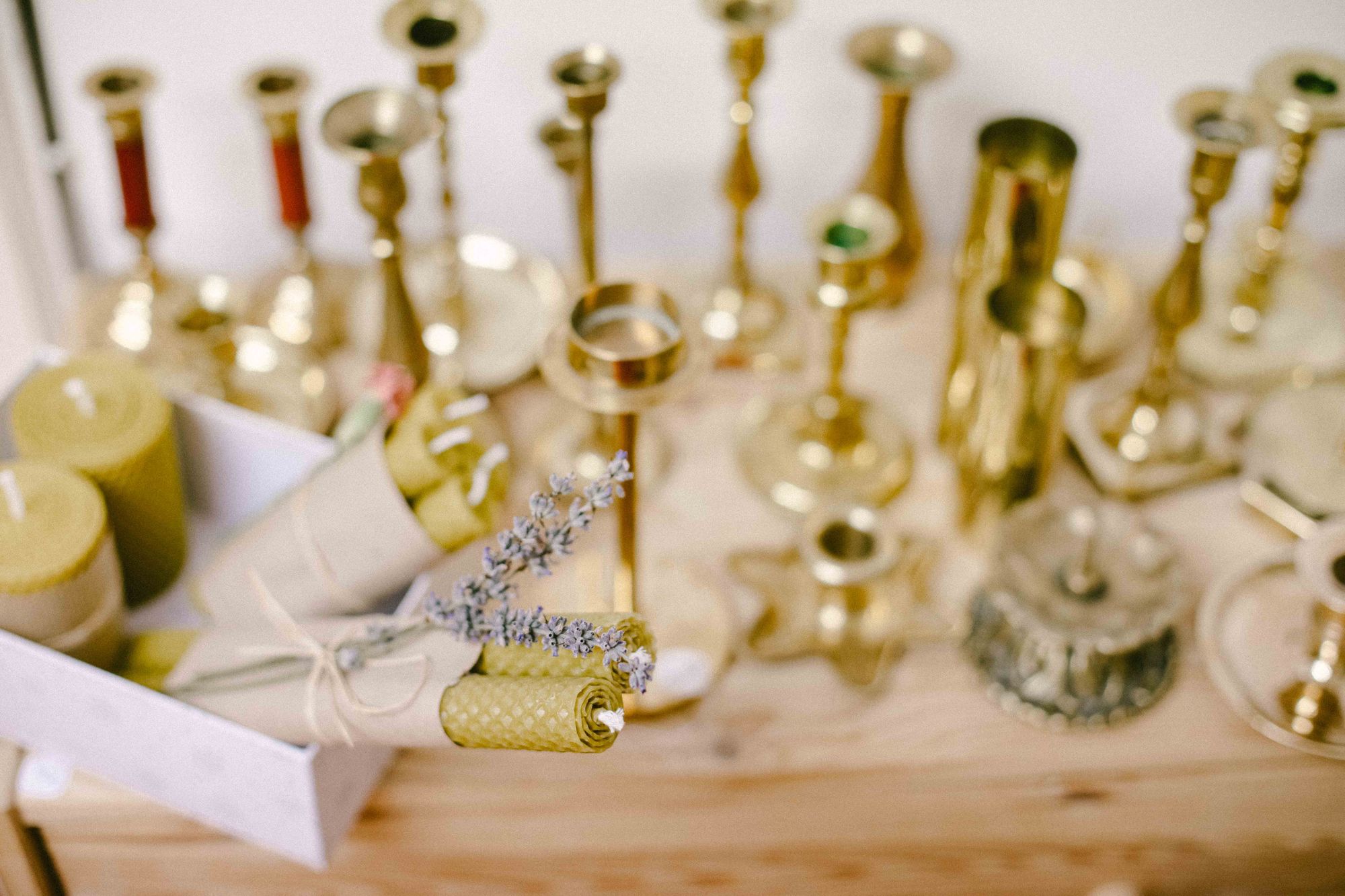 Lumânări rulate manual, din ceară naturală de albine sau lumânări parfumate din ceară de soia turnate în porțelan de colecție și sfeșnice recondiționate, în ton cu frumusețea și delicatețea celorlalte produse.