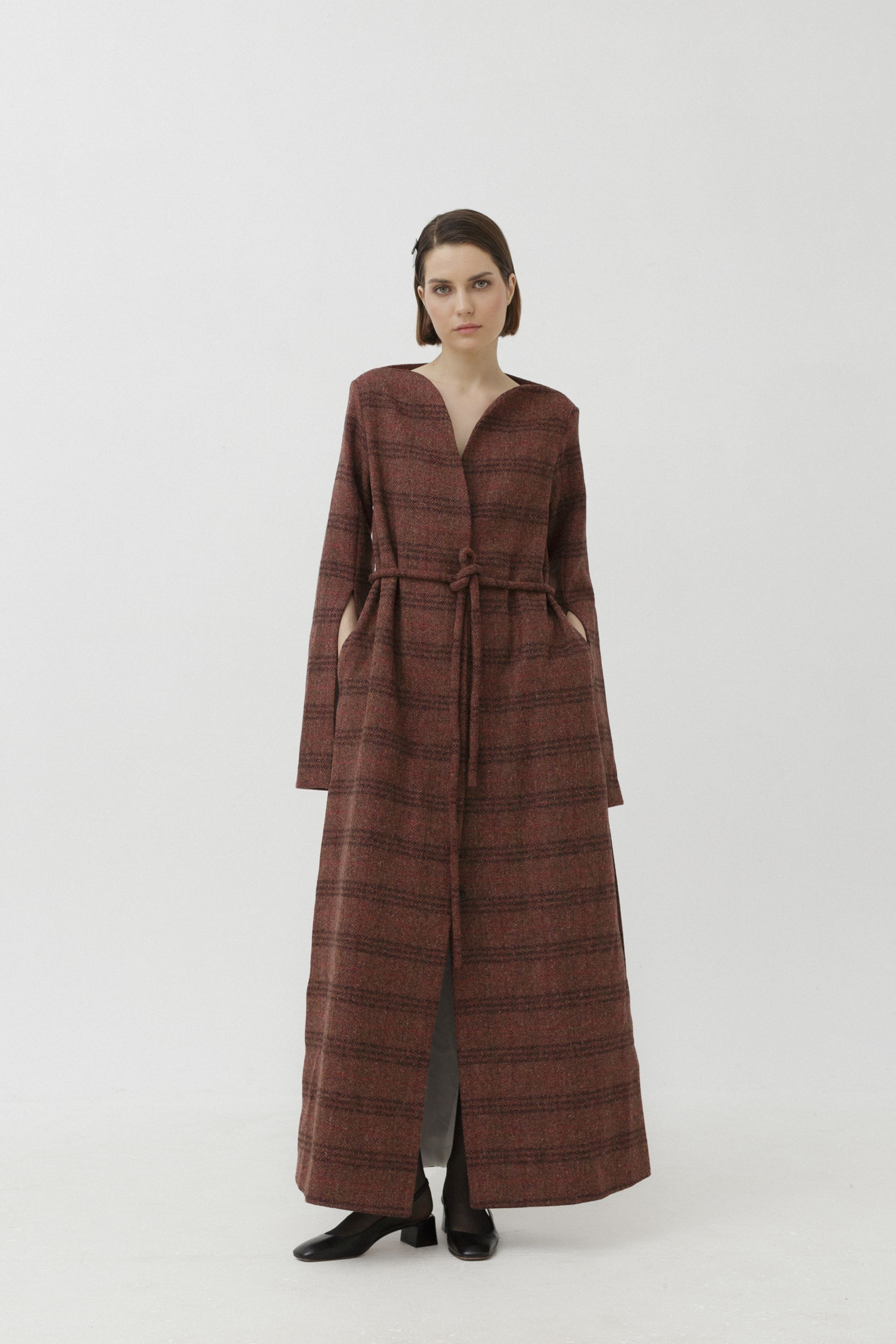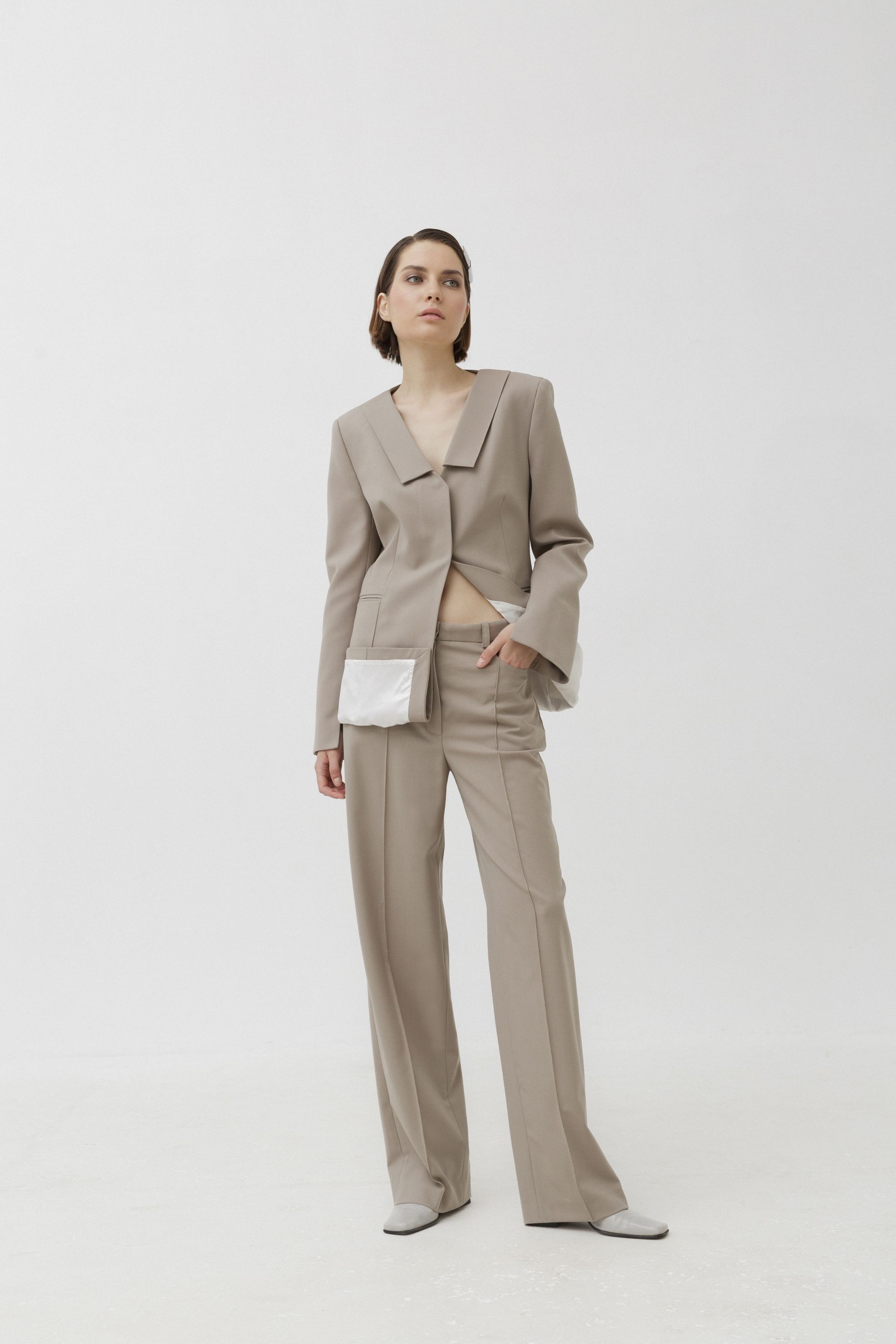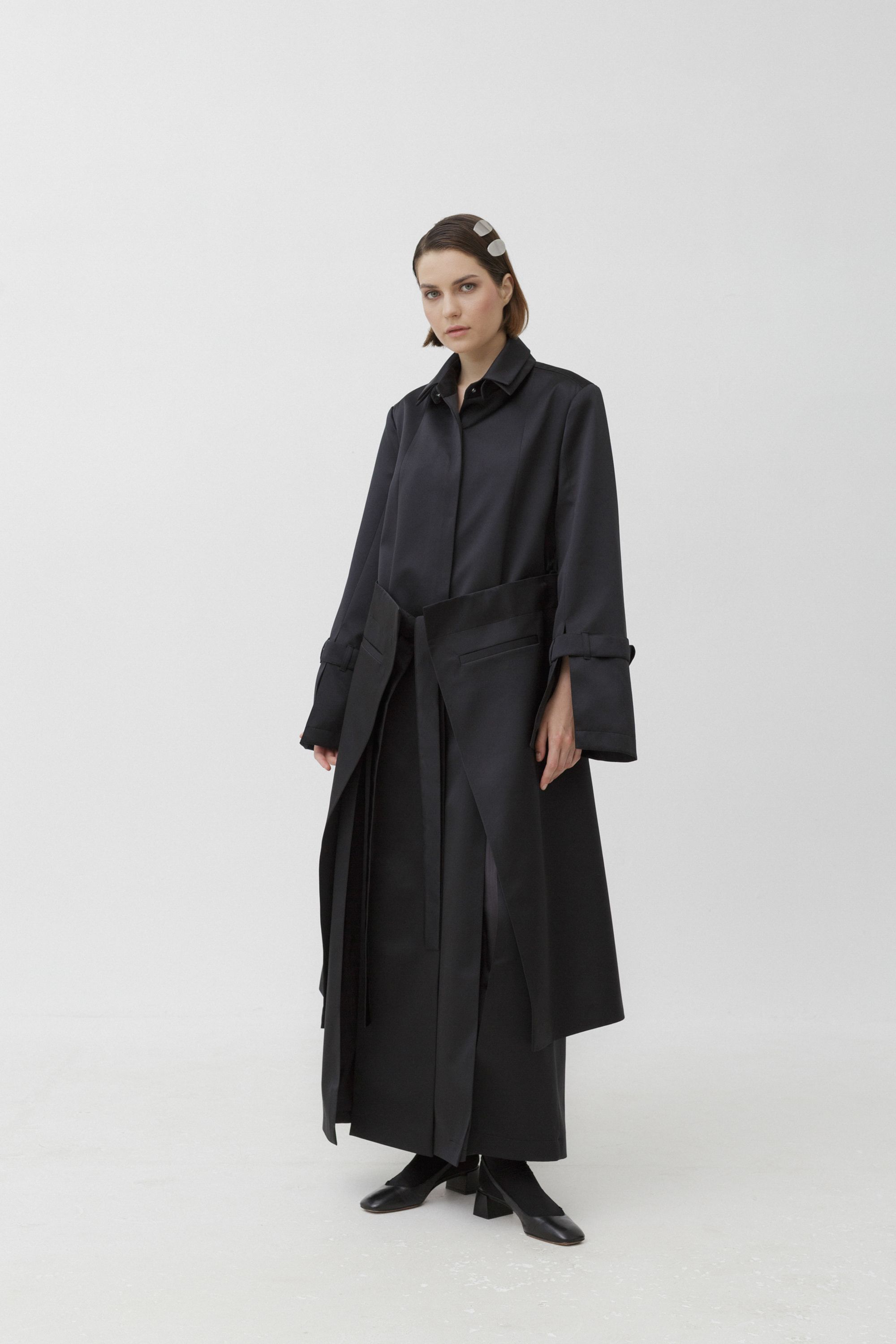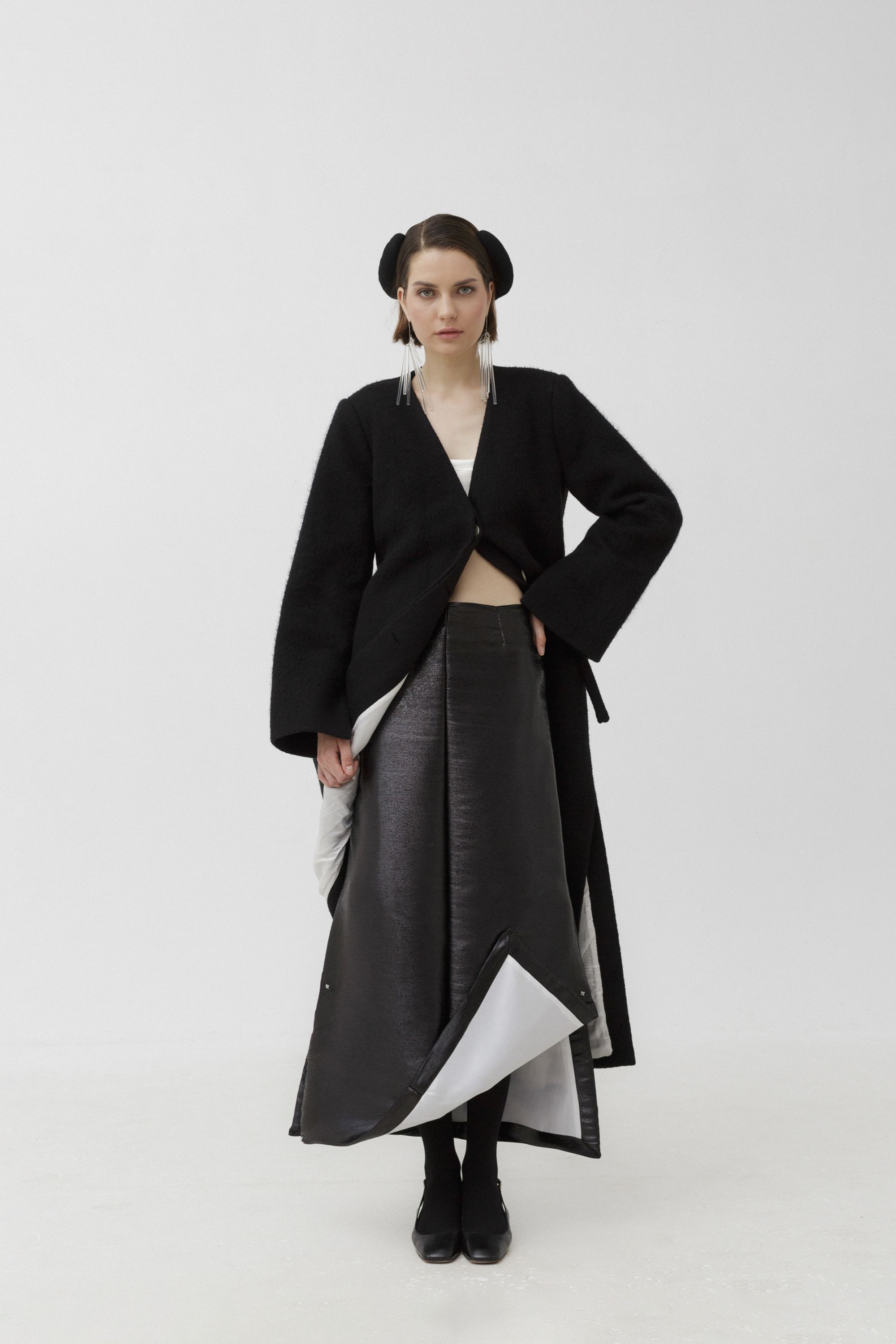In our collection, both suits and coats are offered in different colours and silhouettes, sharing the common thread of their extended form. Within our latest collection, we presented several knitted items, including a sweater with a knitted apron.