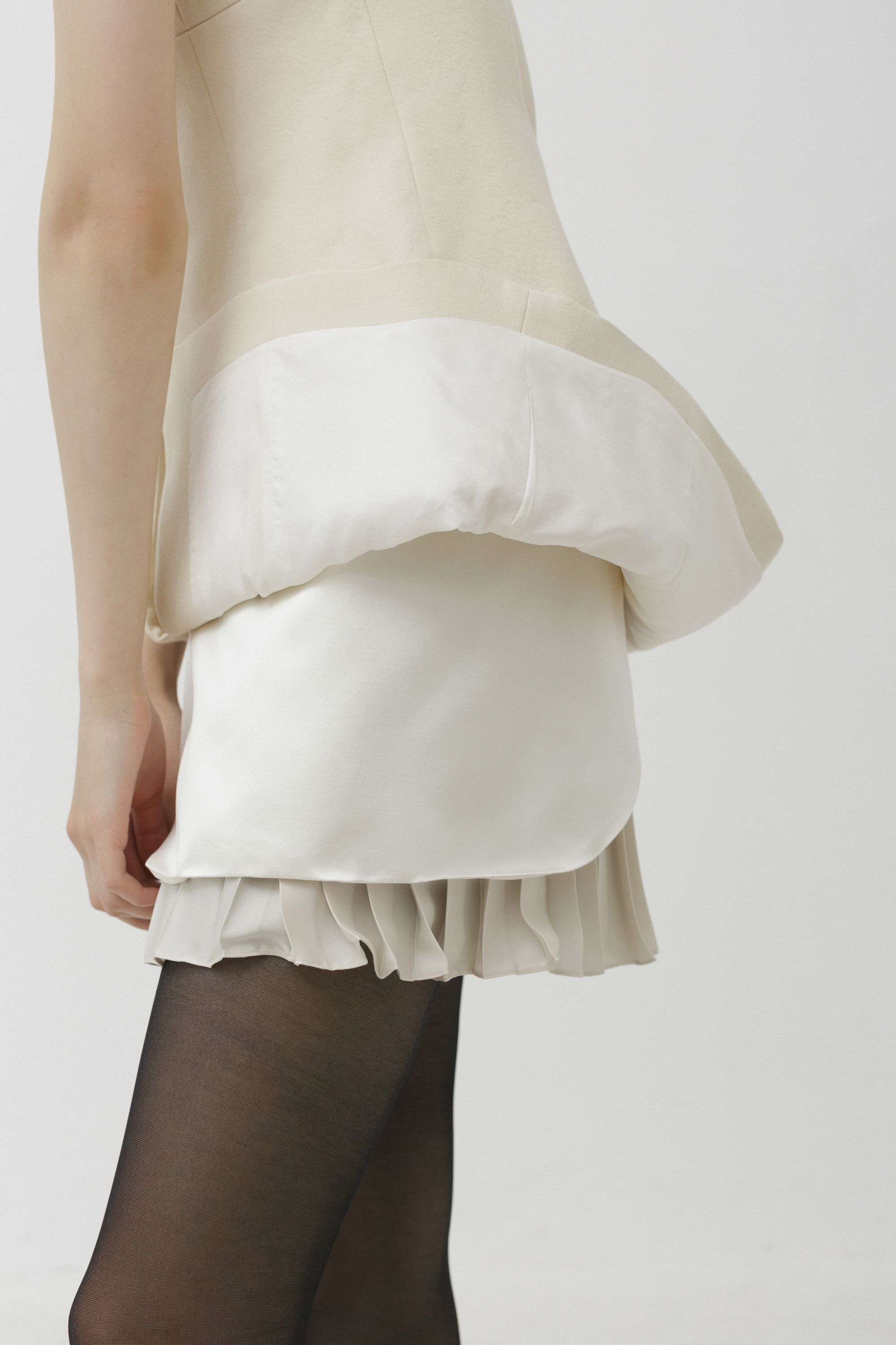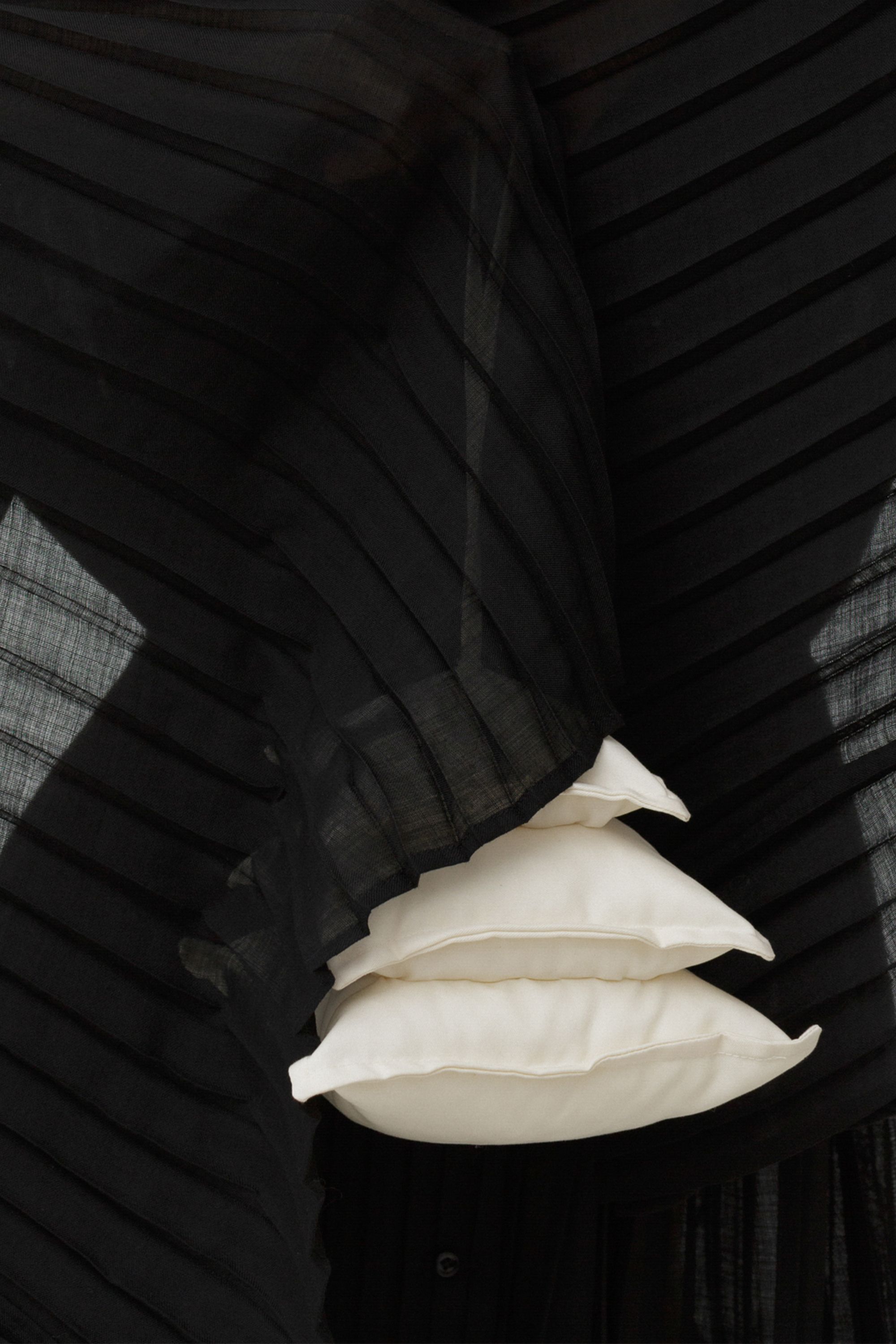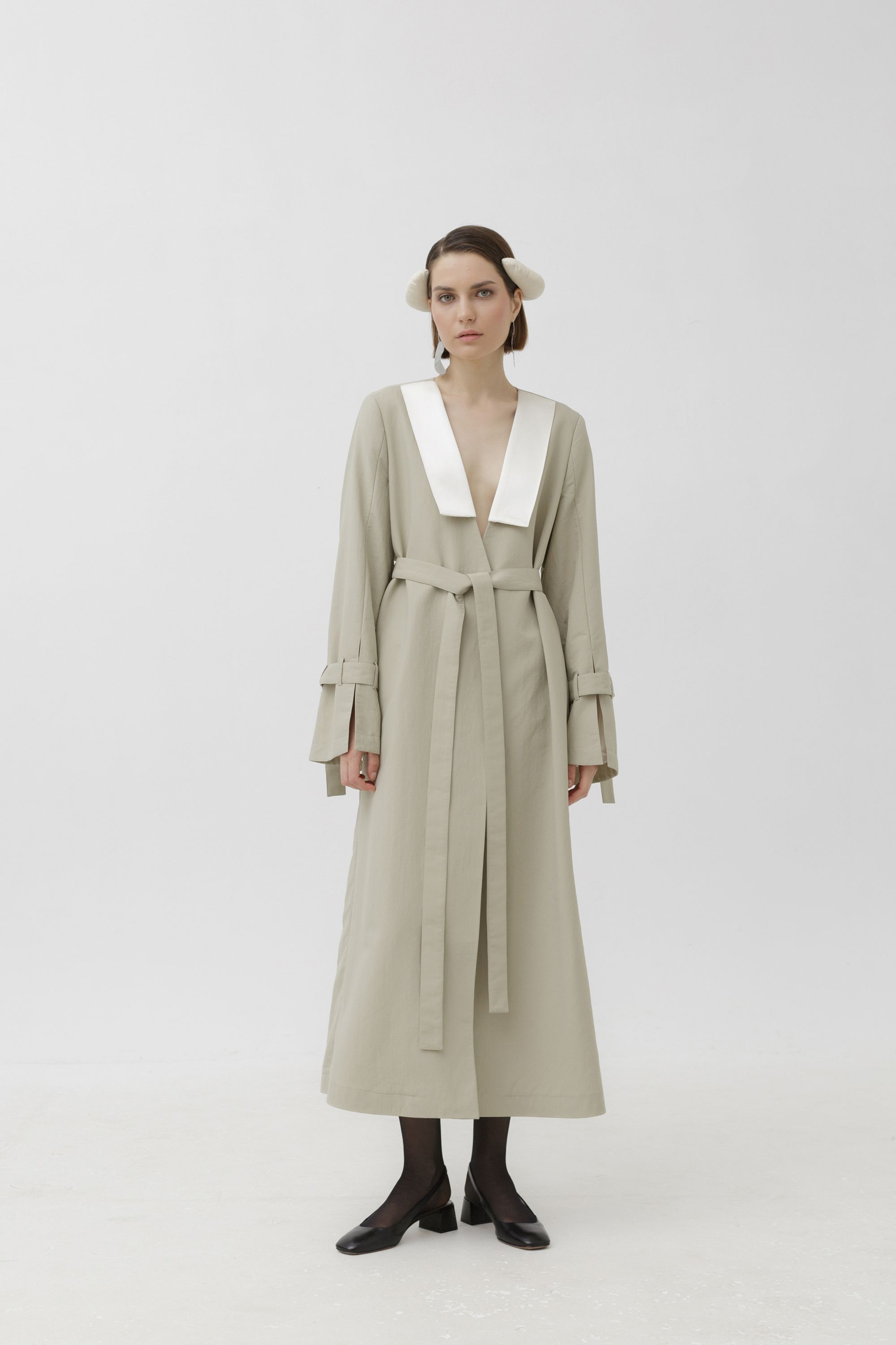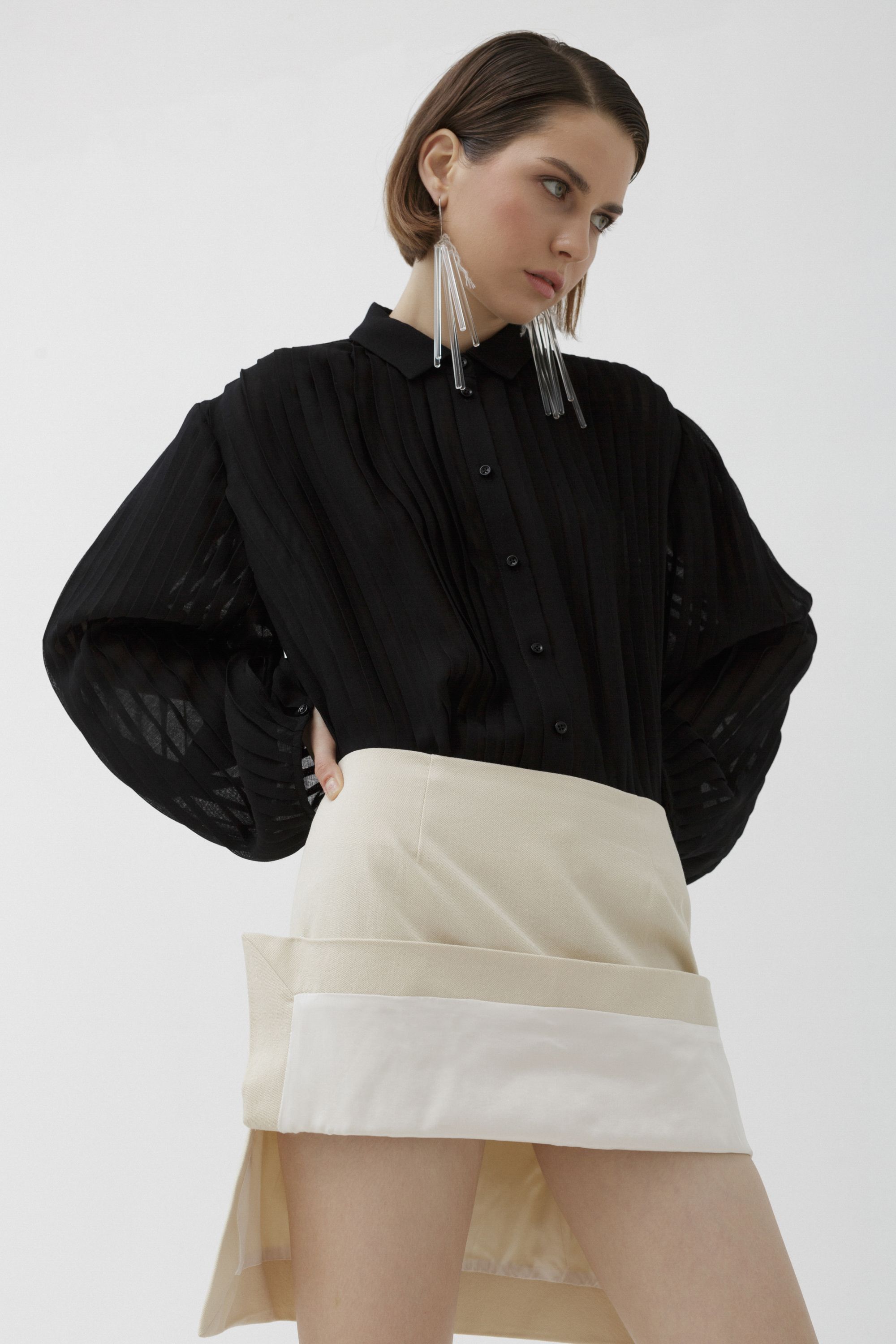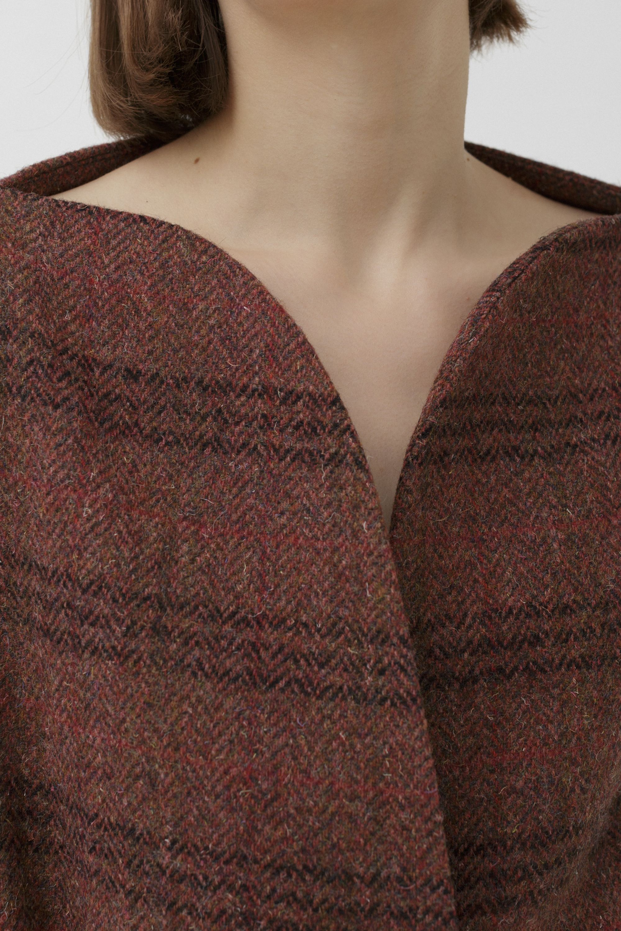 In our collection, both suits and coats are offered in different colours and silhouettes, sharing the common thread of their extended form. Within our latest collection, we presented several knitted items, including a sweater with a knitted apron.