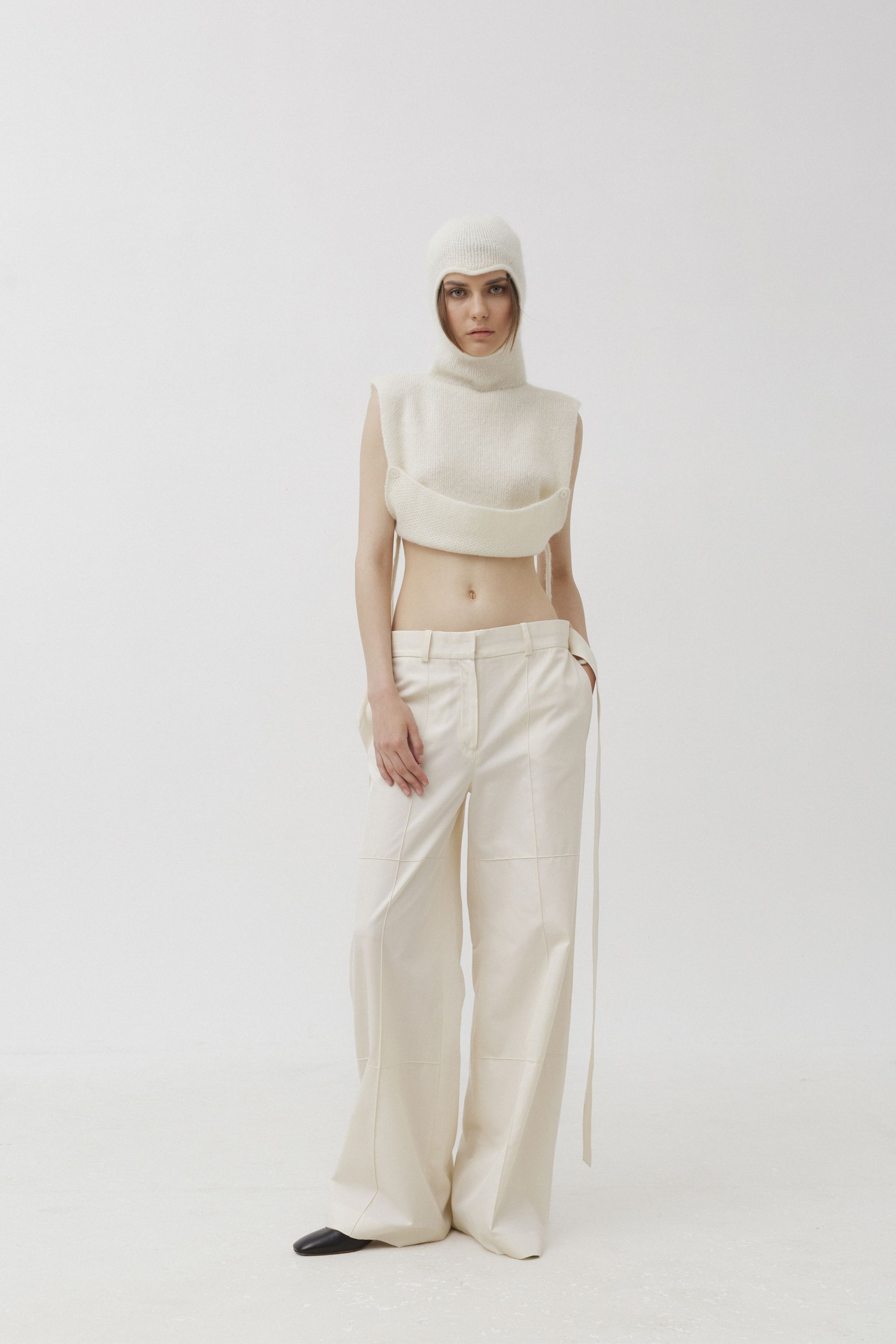 This was one of the first knitted items we created for the OK KINO. It takes the form of a balaclava with a subtly V-shaped silhouette, crafted from soft and fluffy wool.