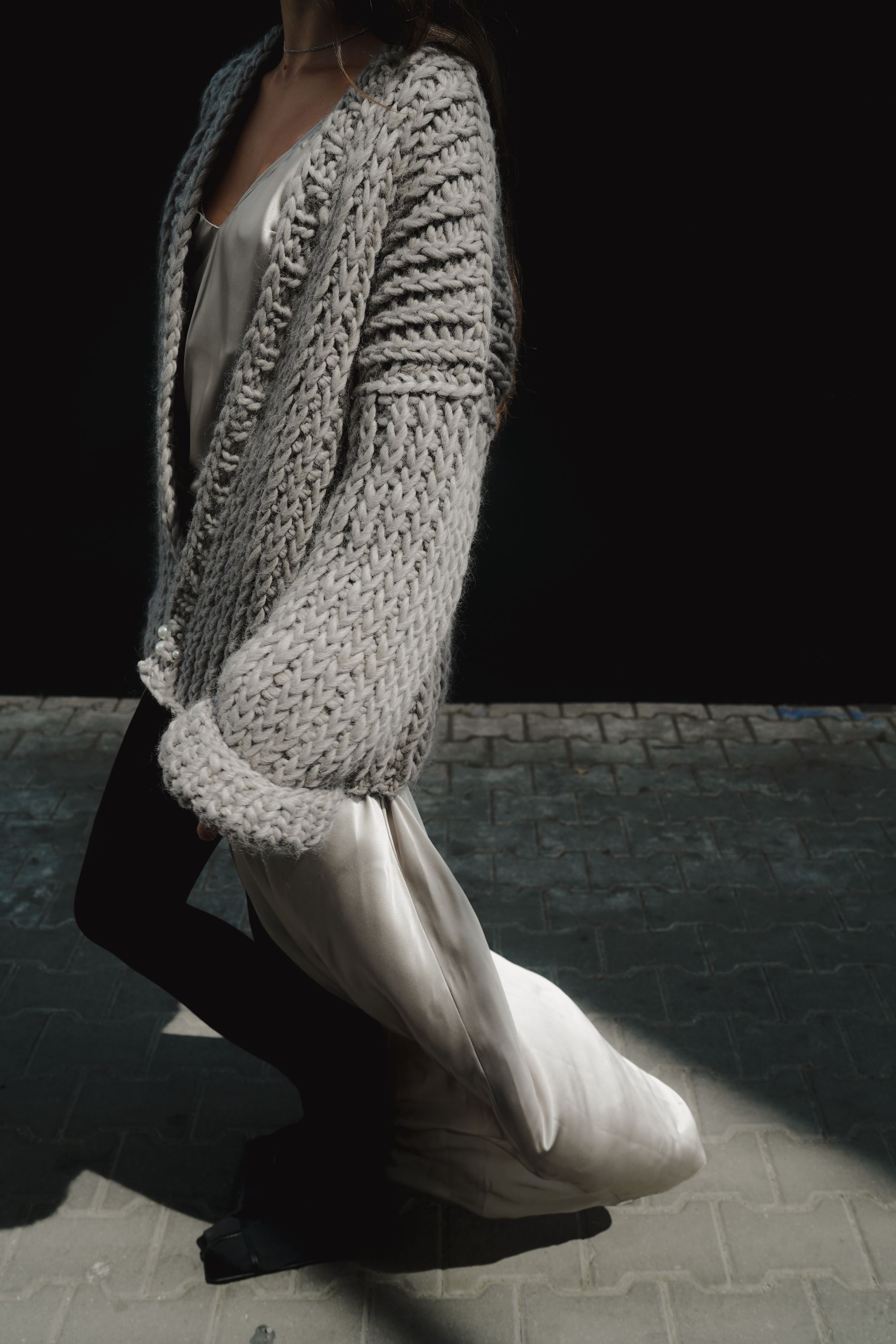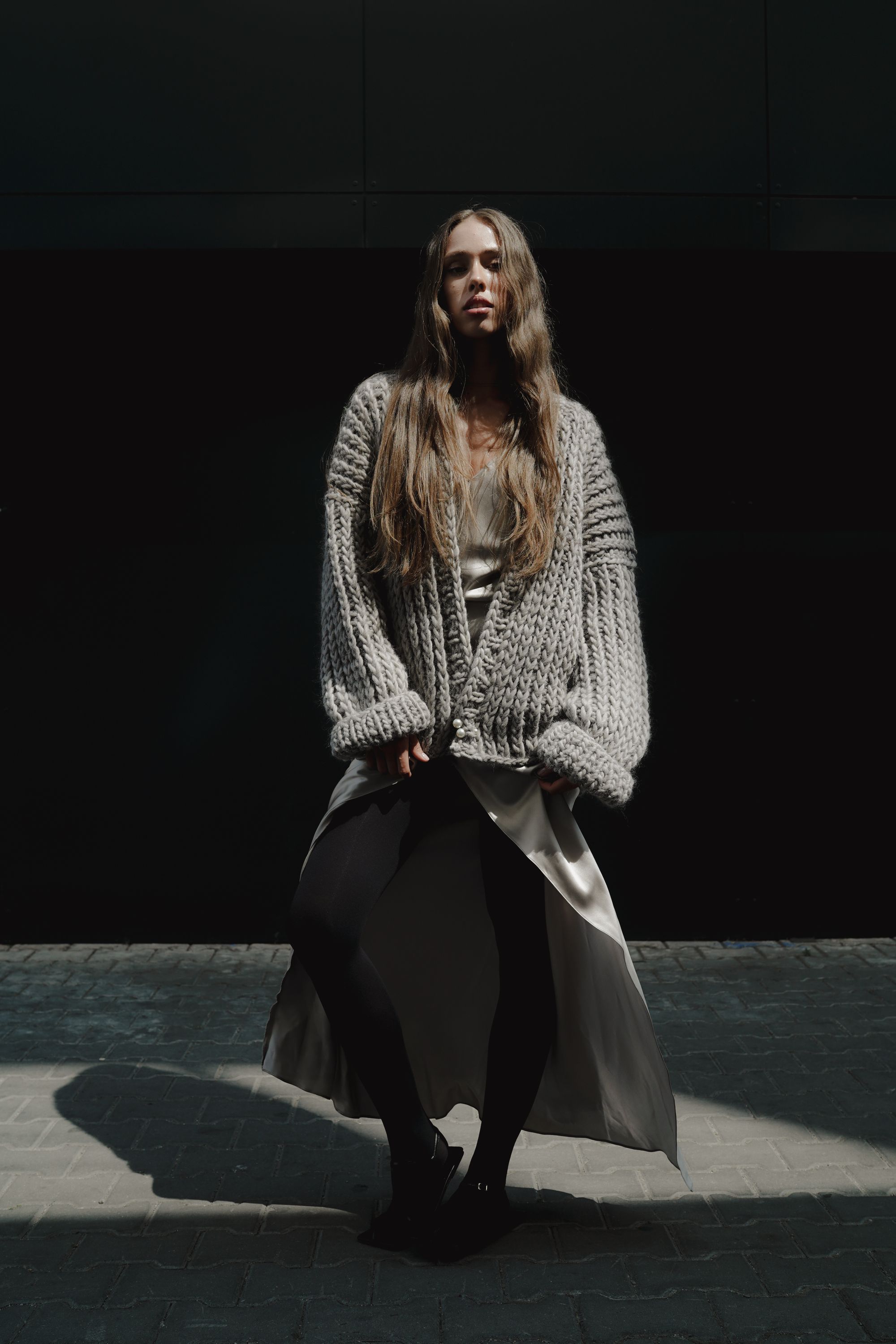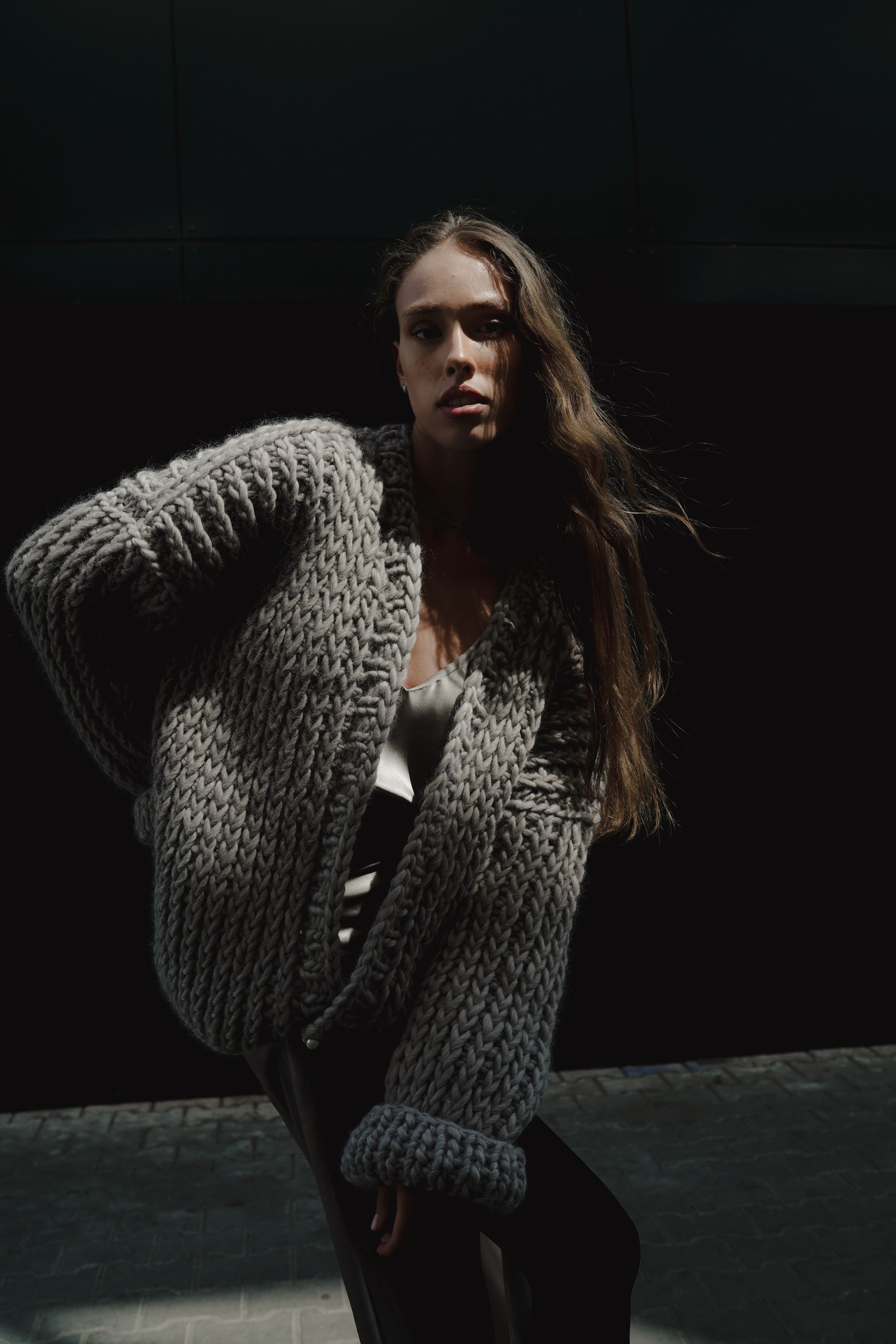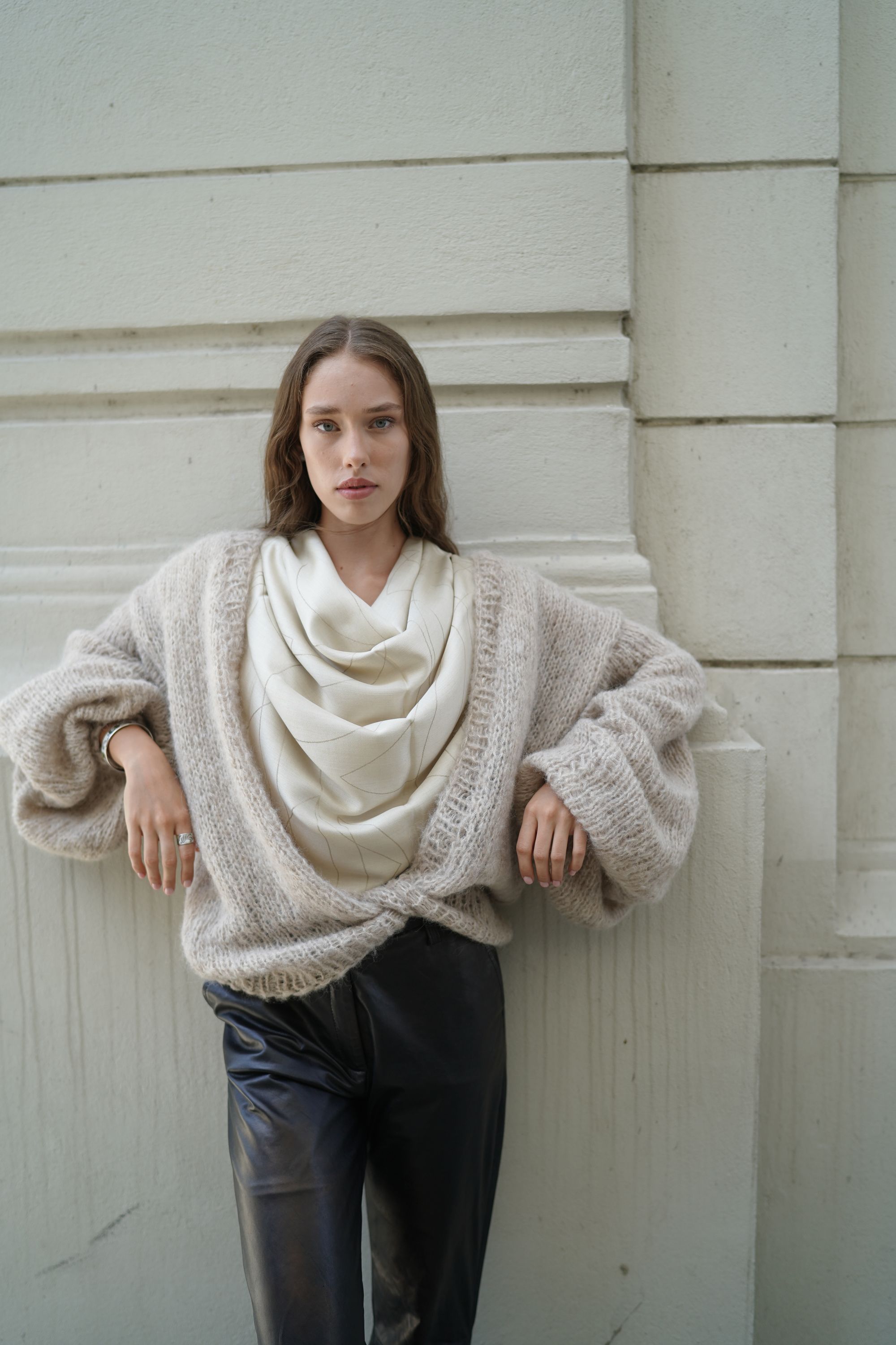 For example, the Black Coffee Cardigan is an oversized cardigan made from a rich mix of ultra-soft alpaca and silk, with voluminous sleeves and a double way to be worn (backless with a pearl accessory for fastening or as a V-neck opening cardigan).
