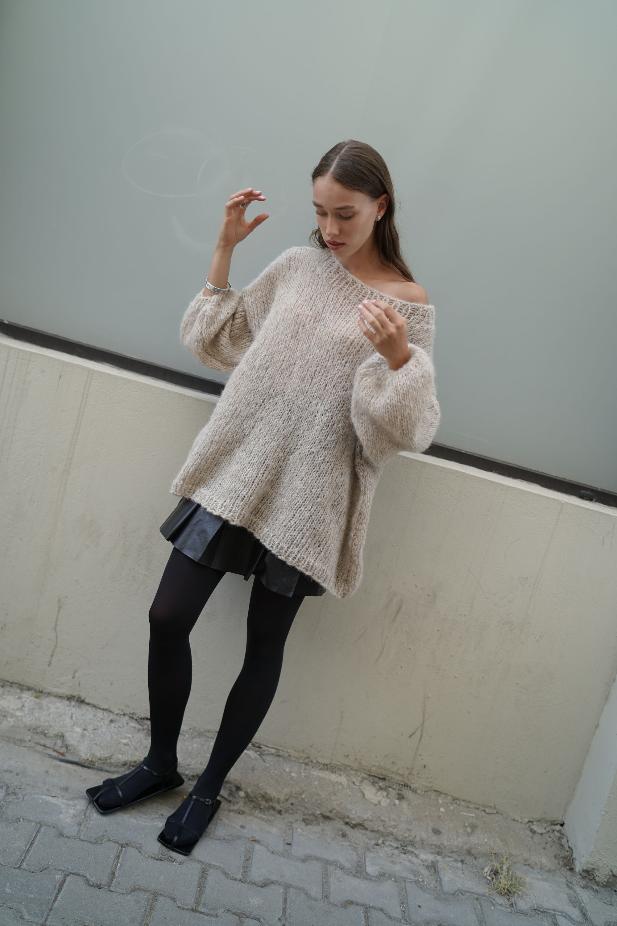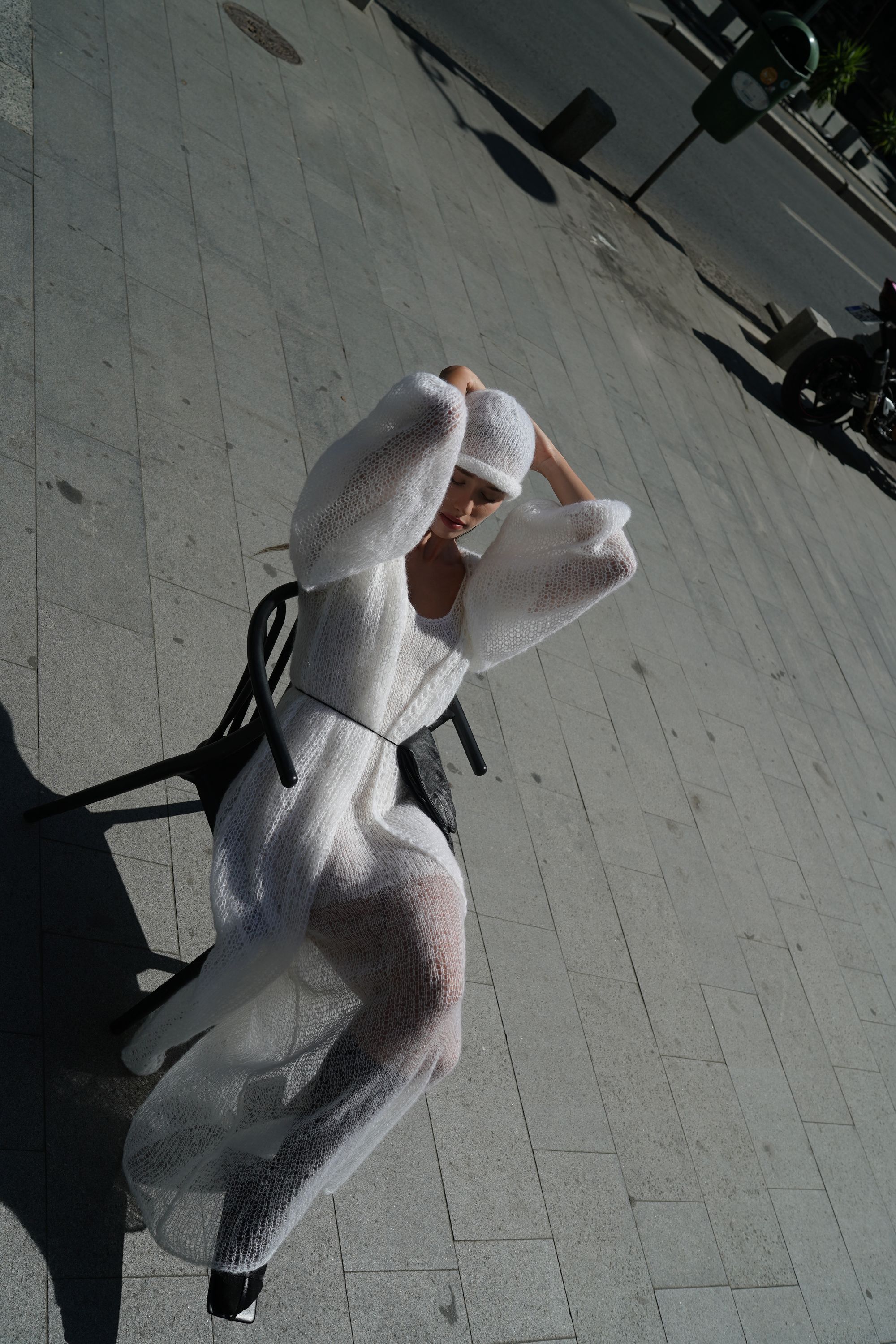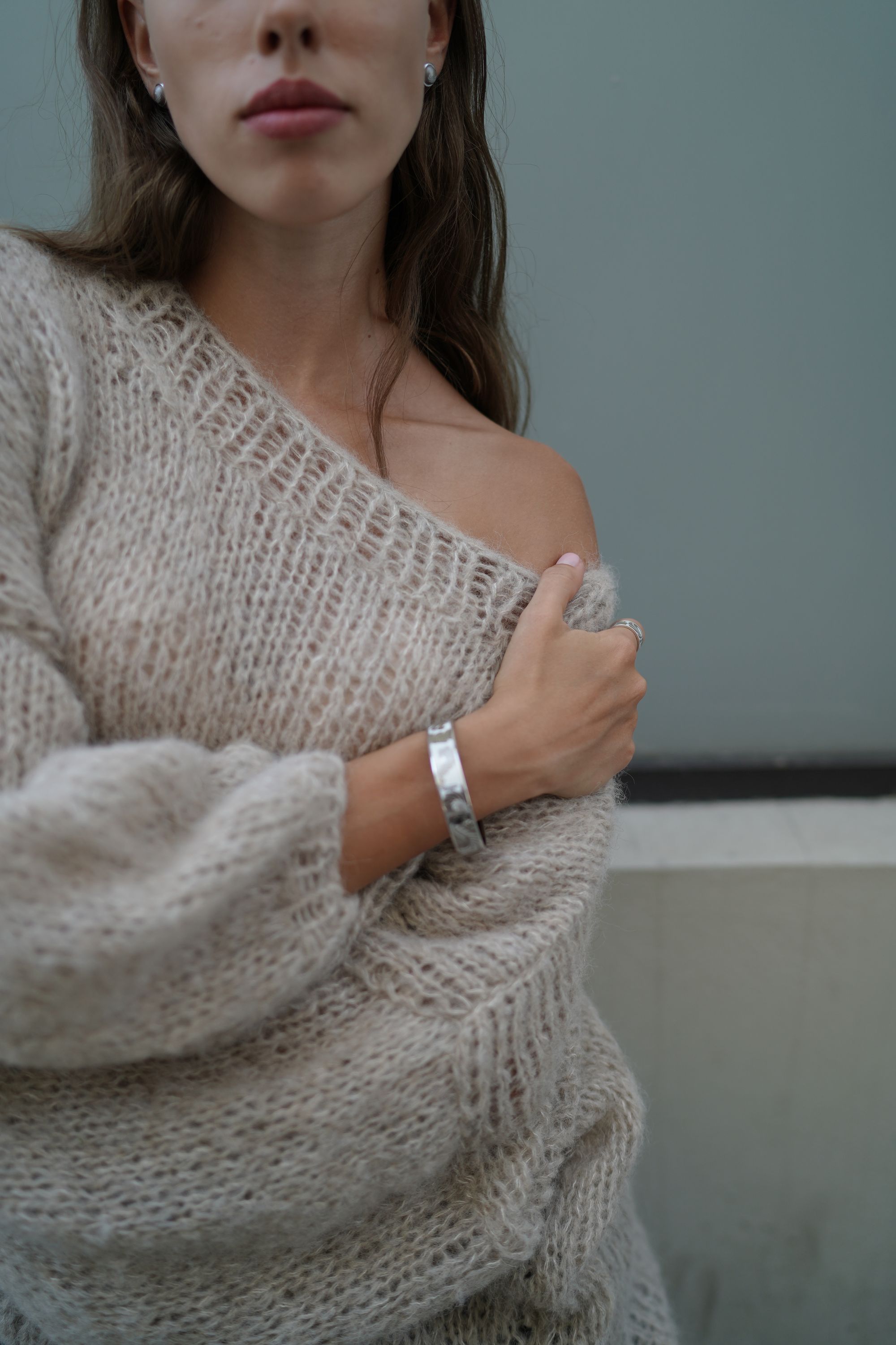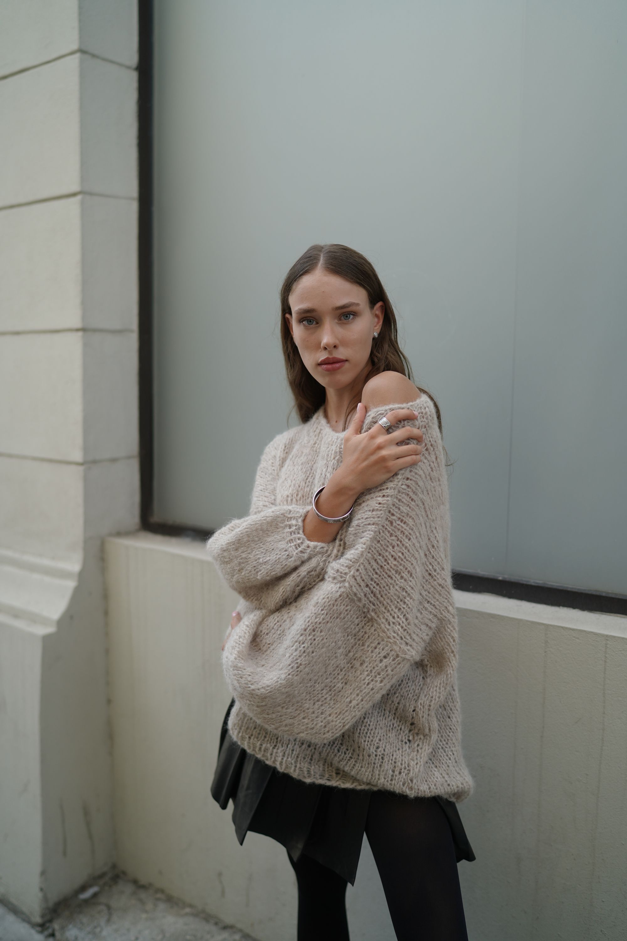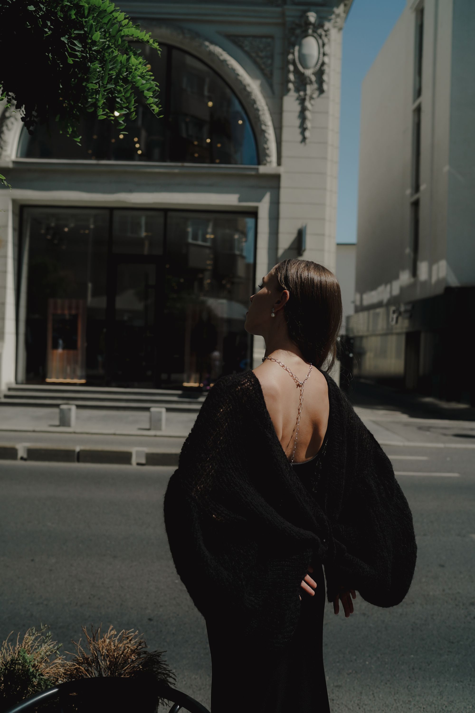 For example, the Black Coffee Cardigan is an oversized cardigan made from a rich mix of ultra-soft alpaca and silk, with voluminous sleeves and a double way to be worn (backless with a pearl accessory for fastening or as a V-neck opening cardigan).