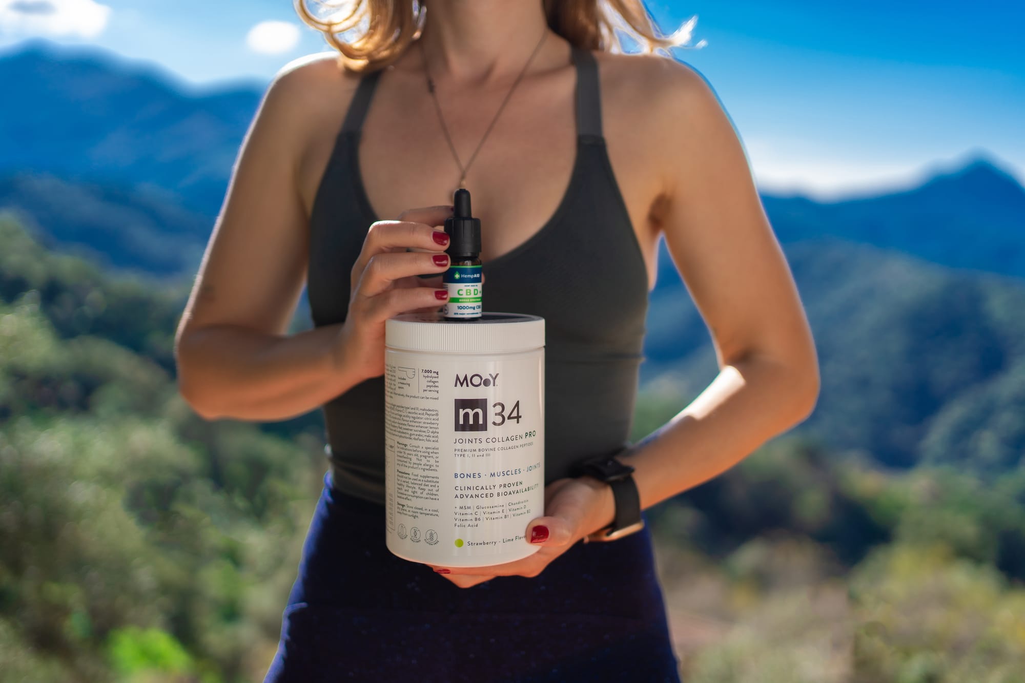 So, my daily routine and rituals include meditation, breathing, yoga, spending time in nature, walking at least 4 kilometres per day, going to the gym once a week, and taking vitamins like Molecules of Youth's M34 Joints Collagen PRO and CBD+ Hemp Seed Oil from HempAID.