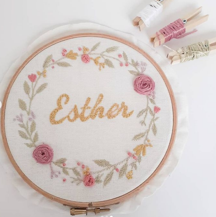 Simona: Anul acesta, cineva m-a întrebat care a fost prima mea broderie. Și am fost absolut convinsă că prima mea lucrare a fost „Esther” – o broderie înflorată, în culori pastelate, oferită cadou prietenei mele din liceu, cu ocazia aniversării de 1 an a fetiței ei. Mintea mea a fost absolut sigură de asta. Era cumva prima lucrare de care eram încântată și mulțumită.