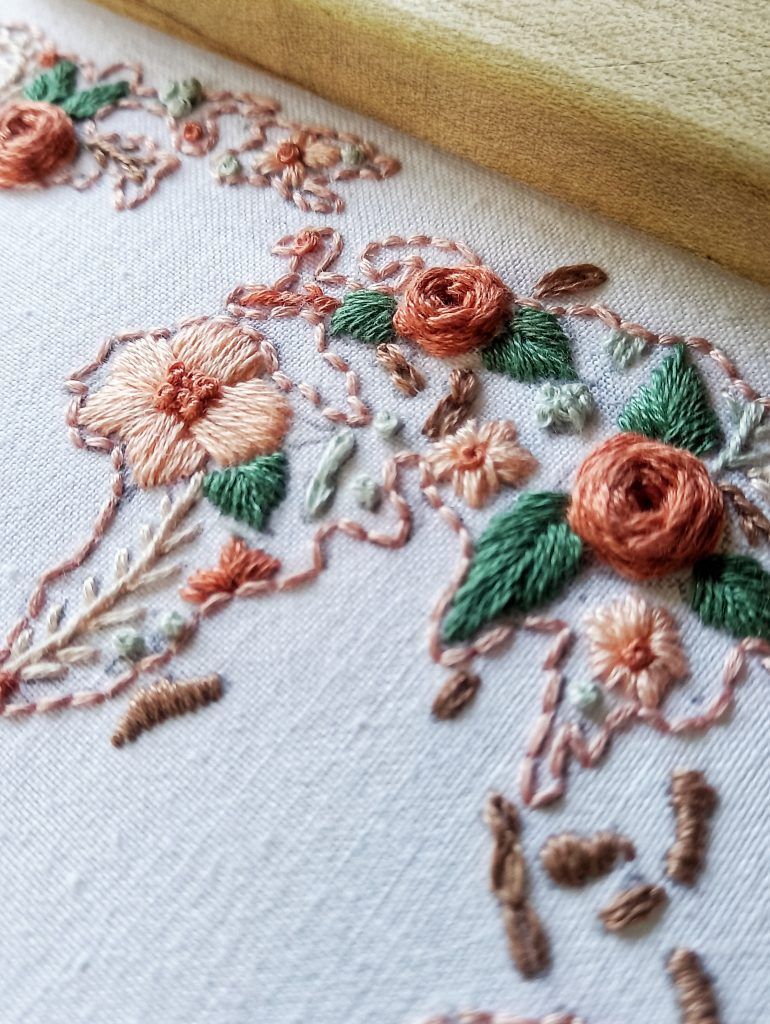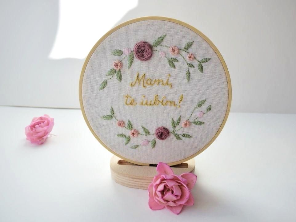 Simona: Sunt tare bucuroasă să văd că există câteva tipuri de broderii care sunt căutate de cei care apreciază astfel de lucrări. Pe primul loc sunt florile și tot ce ține de elemente botanice. Orice frază cu impact emoțional poate fi îmbrăcată atât de frumos și delicat într-o coroniță de flori pastelate.
