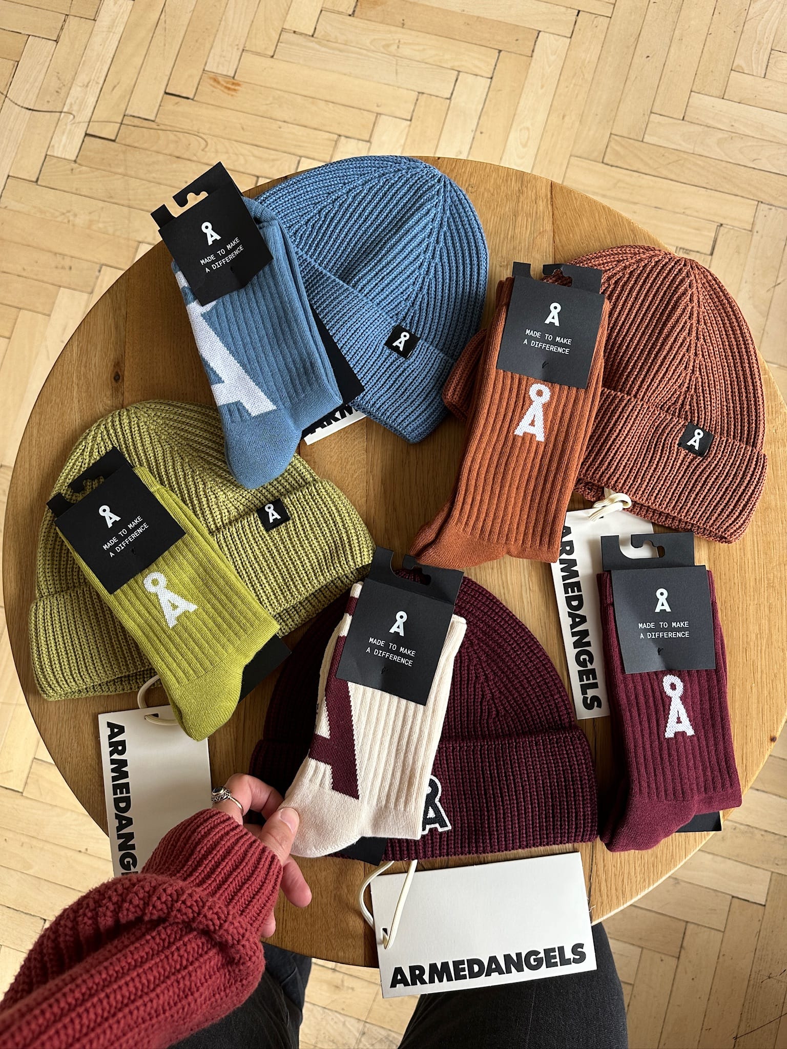 On top of products made from organic or recycled materials, one way to think about gifting sustainable fashion is to look for those timeless pieces that can be worn over and over again. Those loveable basics that end up being shared with a partner, a kid or a parent. Here are a few ideas proudly presented by OTOTO, a platform for premium quality brands with care for people and the planet, with stores in Bucharest and Vienna. Matching socks & beanies, cozy sweaters and recycled sneakers.