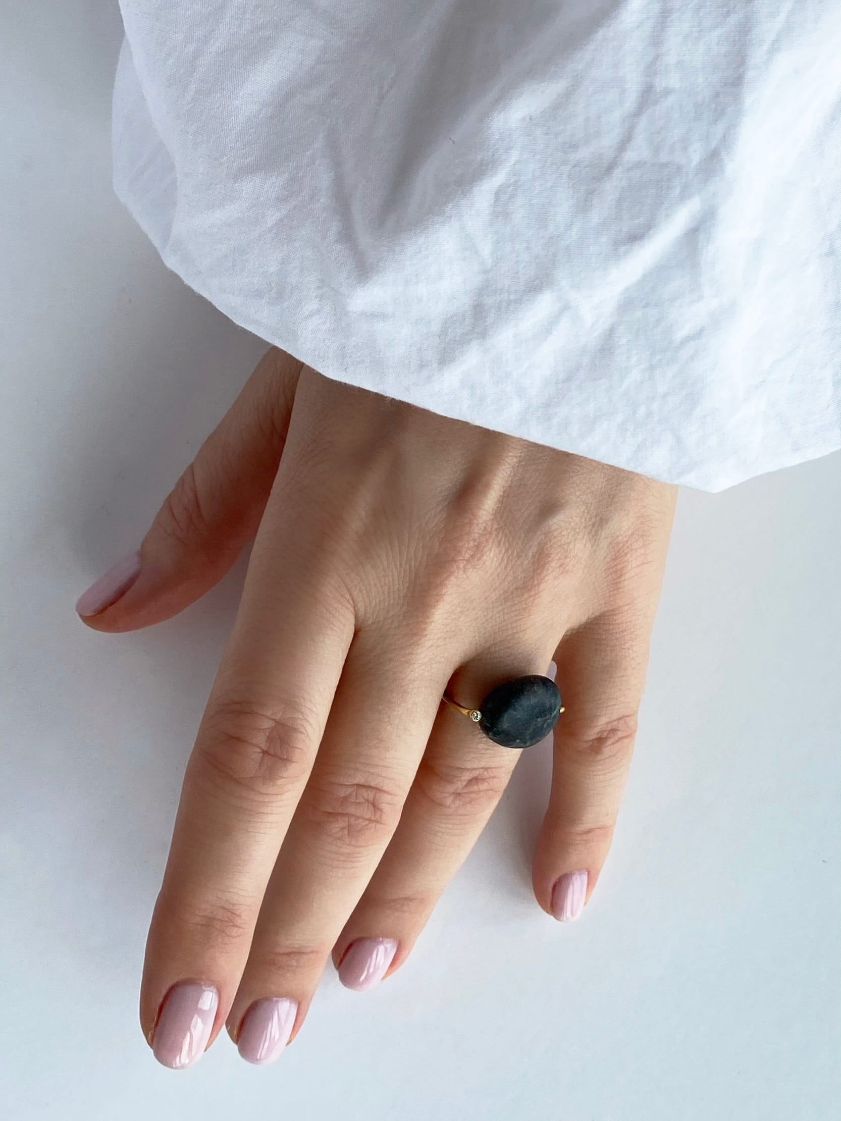 The Pearl & Pebble Diamond 18k Gold Ring, designed by Dolly Boucoyannis, is inspired by the ant beach and it is entirely created by her. Each version of this ring is one of kind because the colour and the shape of the pearl and the pebble are unique each time. The same goes for the Pearl &Pebble Diamond 18K Gold Necklace.