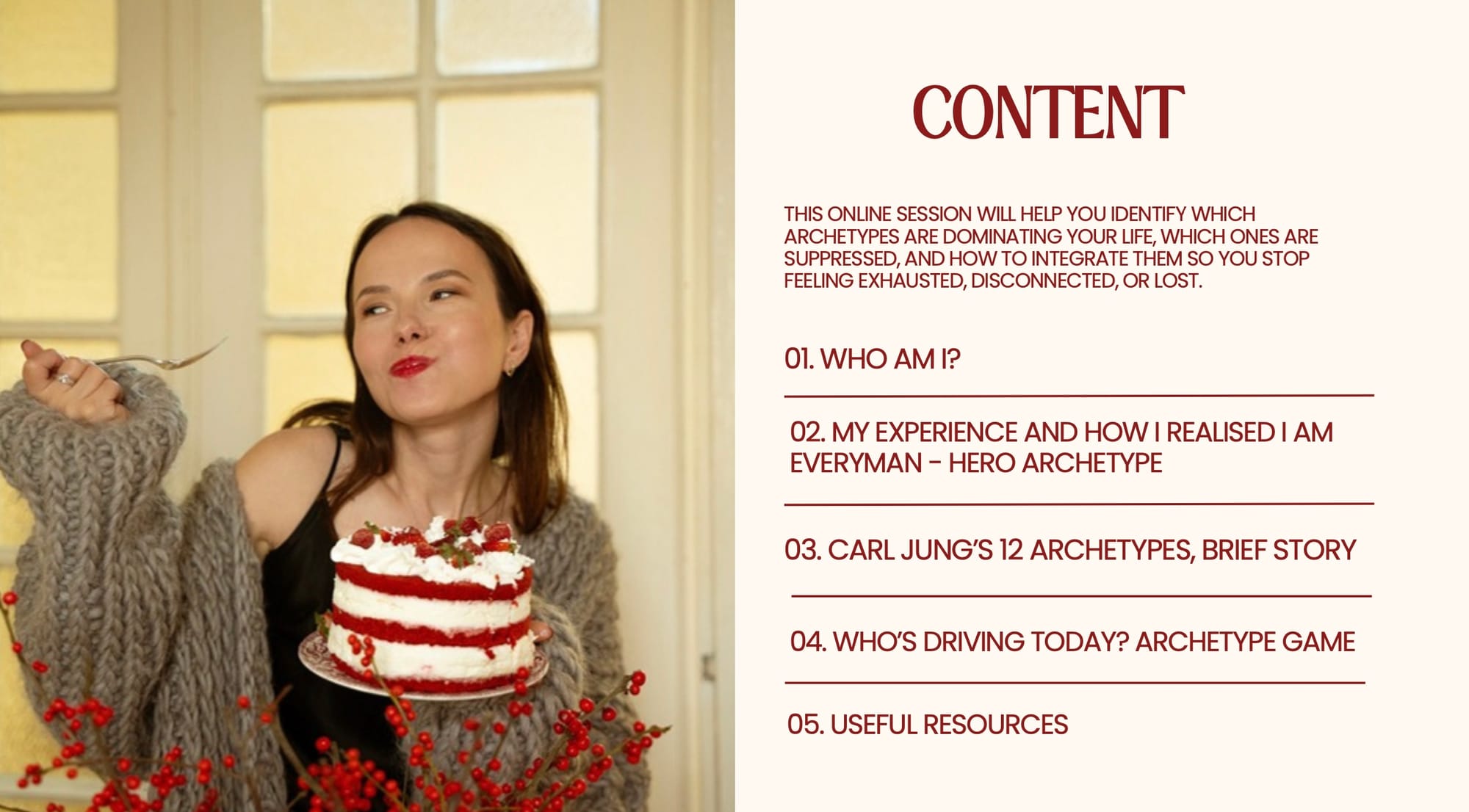 - Next, you dive into understanding your patterns through archetypes, identifying which aspects of yourself are in control and which ones have been silently managing the situation.