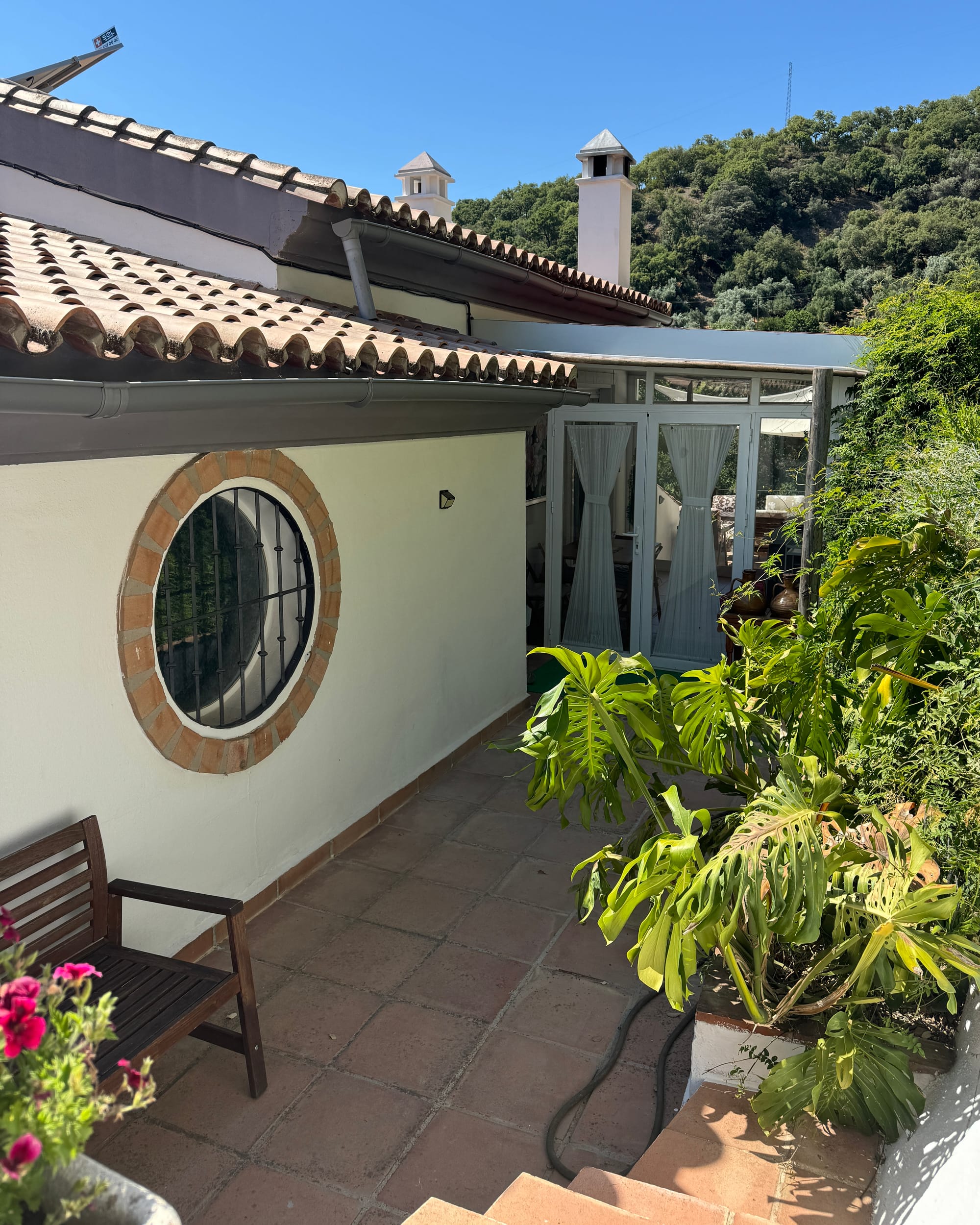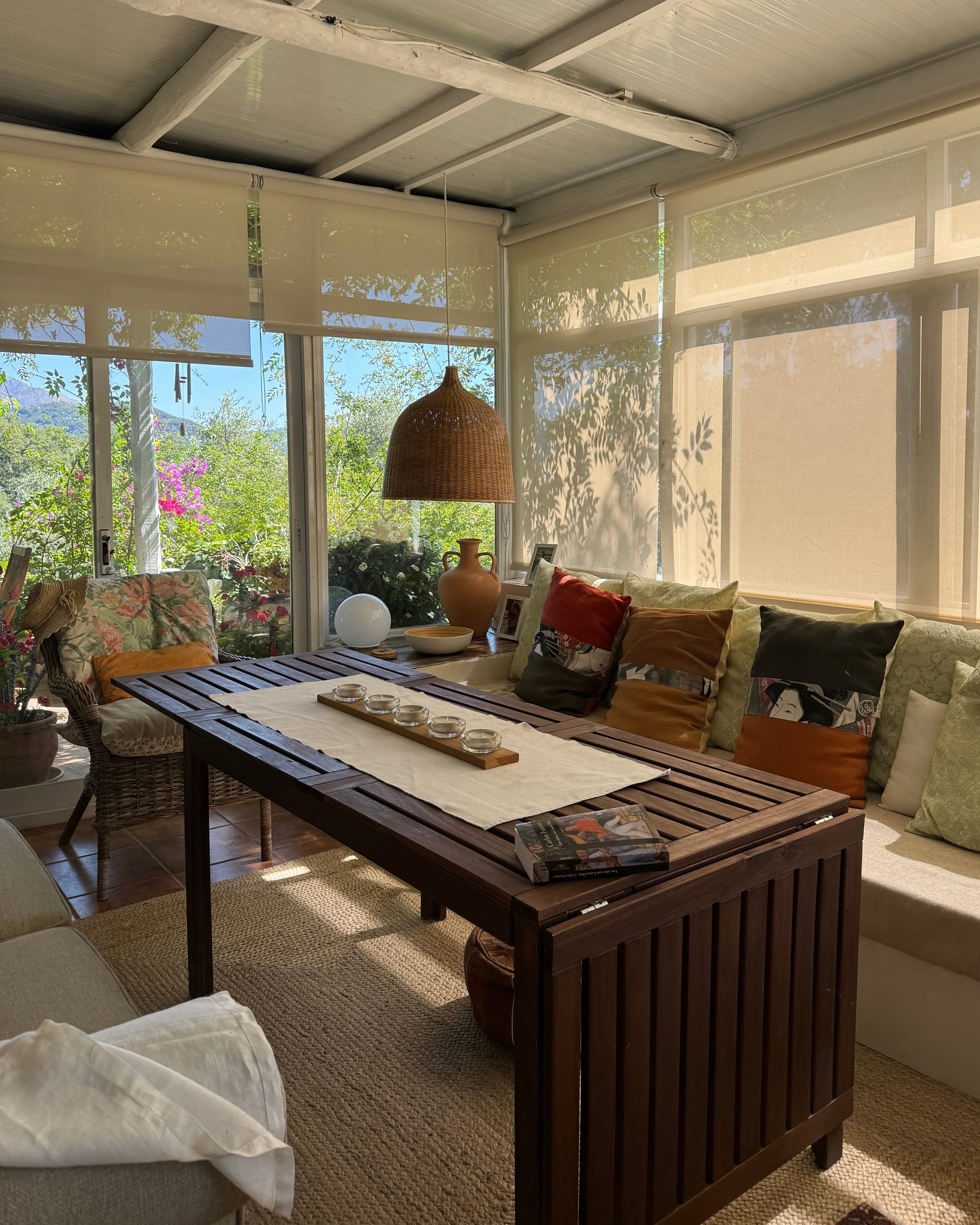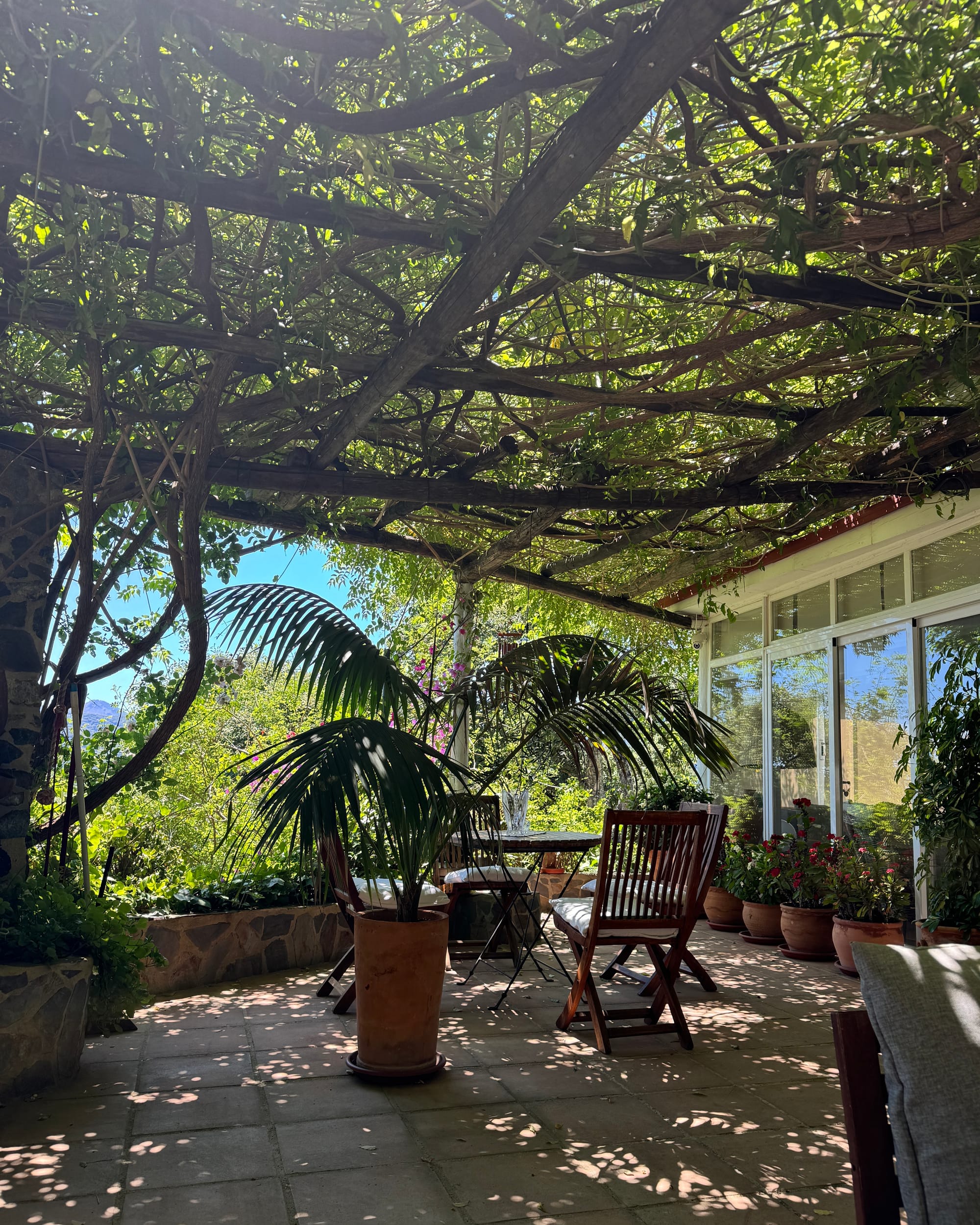 Decirte cuál es mi rincón favorito sería difícil porque no hay algo concreto. Todos los rincones tienen alma propia. No hay una sola piedra traída al azar. Todo está hecho con una dedicación, con esfuerzos, con un amor, entonces, este rincón donde estamos ahora me encanta a estas horas de la tarde. Pero en la noche, me encanta subir a mi habitación y ver todas las montañas porque las paredes son de cristales. Hay, me llena de satisfacción. Pero si nos vamos por el porche de la cocina donde está la piscina y me quedo ahí mirando las flores y mis plantas, digo: ¡qué patio más bonito tengo!