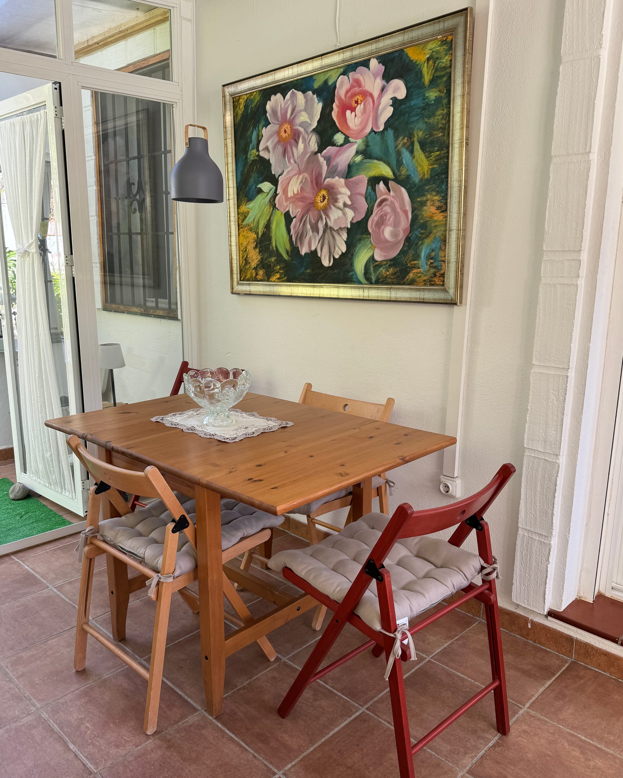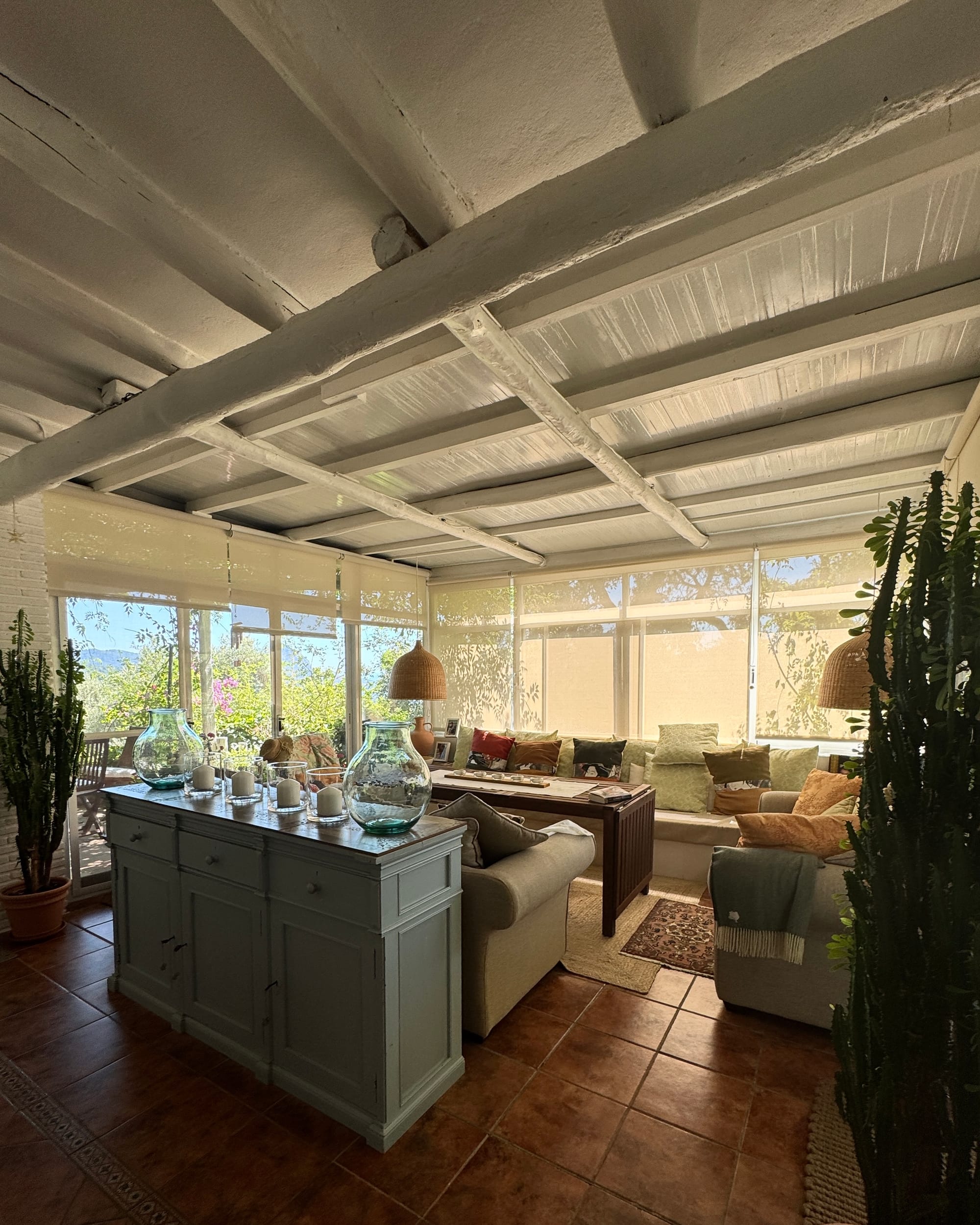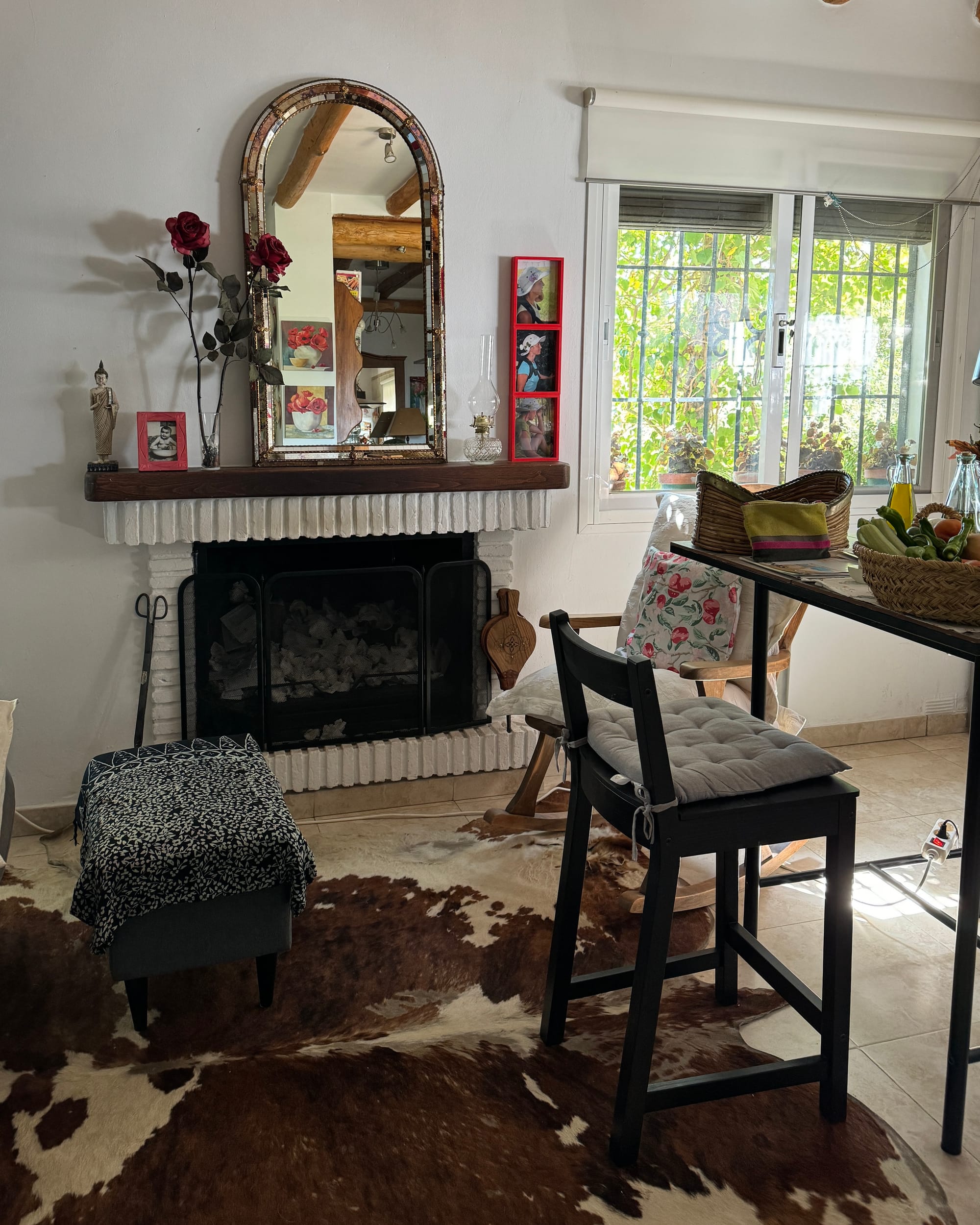 En el interior de mi casa me gusta el comedor de verano que todo es cristal, cada punto tiene una pincelada especial. y tiene un encanto especial para un momento determinado. Me siento satisfecha en cualquier rincón. En invierno, me quedo en este comedor de invierno con la chimenea encendida y mi mesa grande de trabajo, para sentir el calor de la chimenea cuando me llega. ¡Gracias, gracias, gracias a la vida por todo lo que me ha dado!