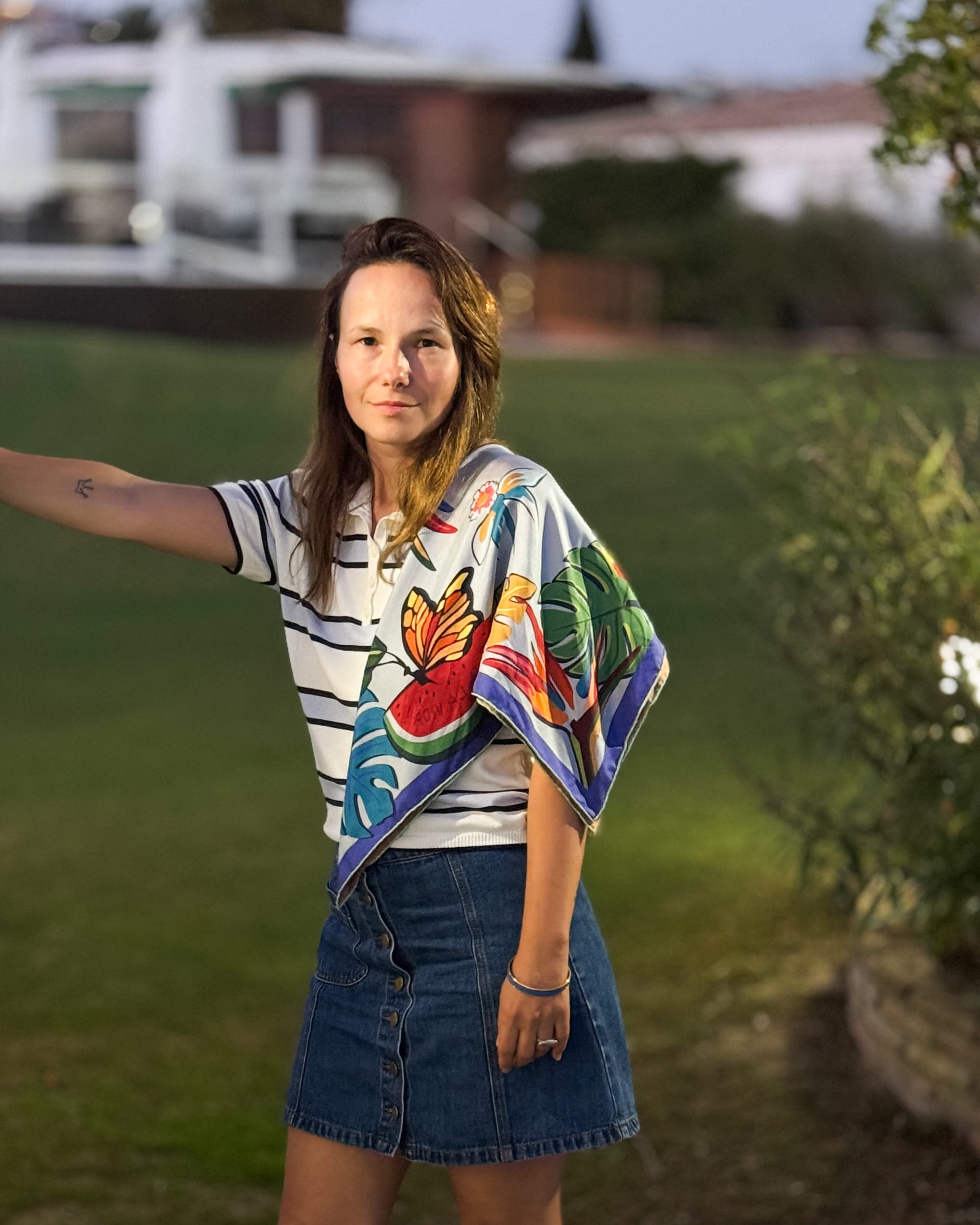 In these photos, I am wearing the double-faced silk scarf. Its motifs - butterflies symbolising new beginnings, parrots representing freedom and vitality, and strelitzias expressing a deep connection to nature - resonate deeply with how I see life today.